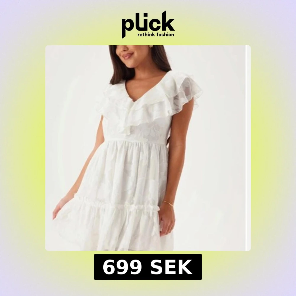 Säljer en söt vit klänning med volangdetaljer och v-ringning. Klänningen har en luftig passform och är perfekt för sommarens varma dagar. Den är ärmlös och har en kort längd som ger en lätt och ledig känsla. Säljer två stycken i två storlekar då jag köpt en annan klänning.