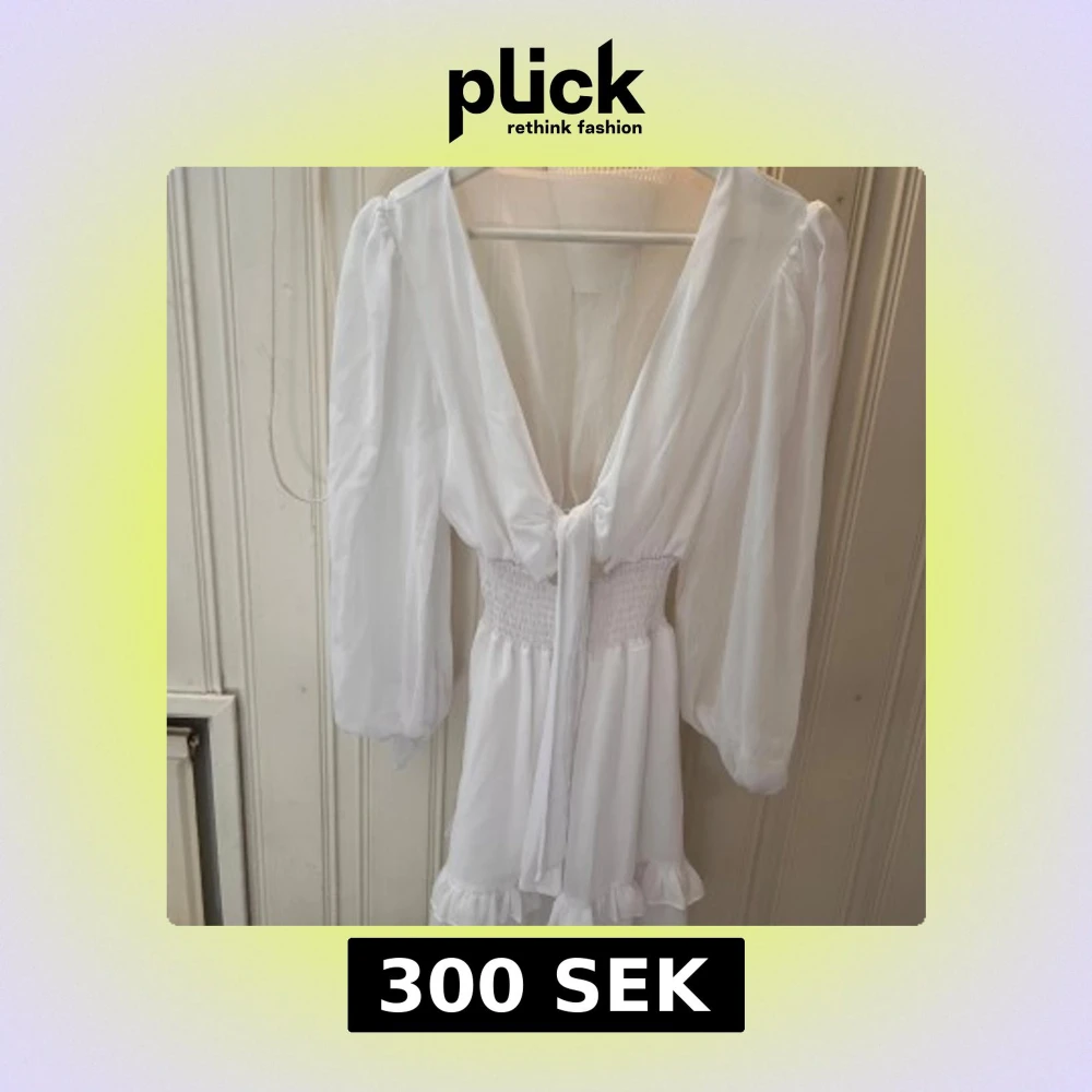 Säljer en söt vit klänning med v-ringning och volangdetaljer. Klänningen har långa ärmar och ett knytband i midjan för en fin passform. Perfekt för sommaren