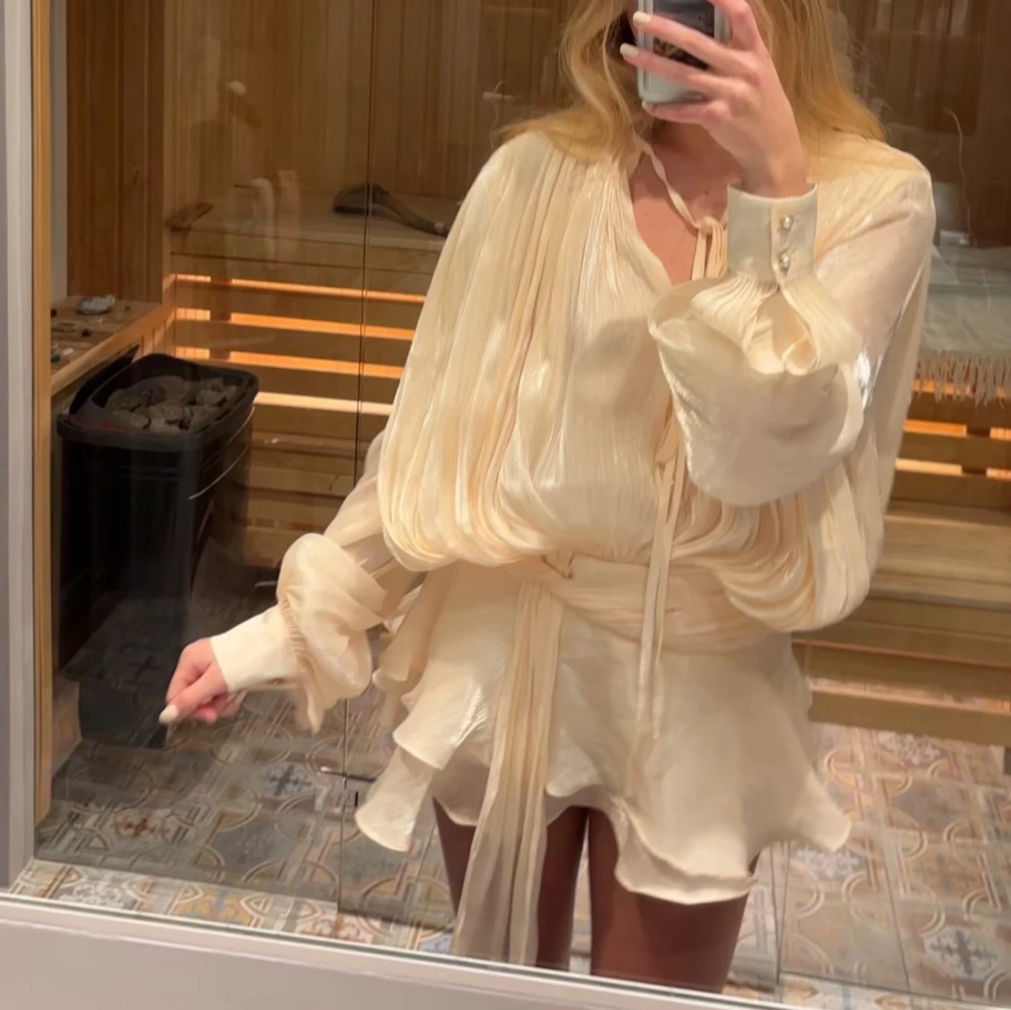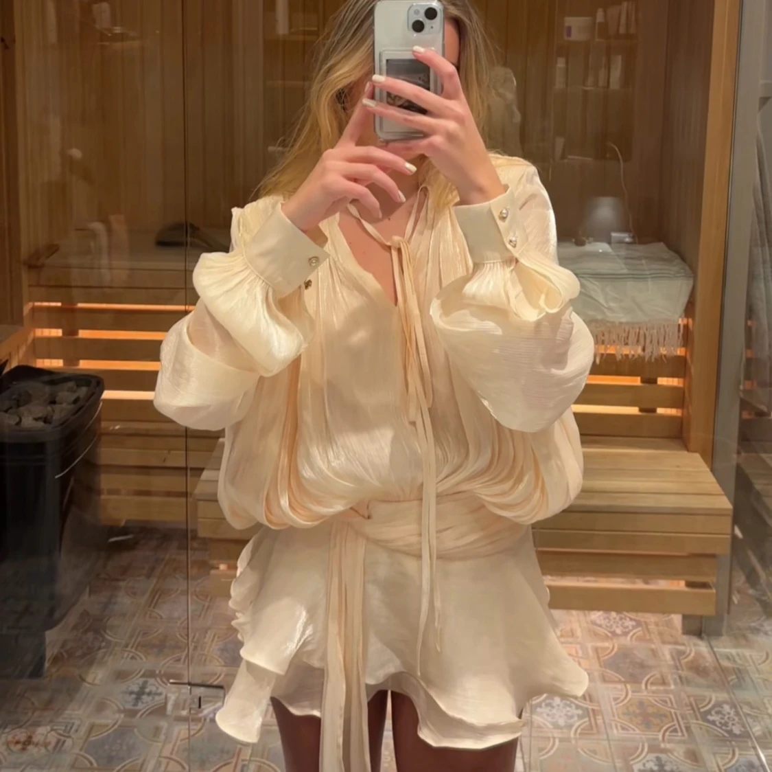 Säljer en eleganta vit/champagnefärgad klänning med volanger och knytband i midjan. Aldrig använt nypris är 1800 kr. Klänningen har långa ärmar med knappar vid ärmsluten och en v-ringad design. Den har shorts under i samma material som klänningen vilket är så skönt speciellt om man ska ha den till student eller liknande.