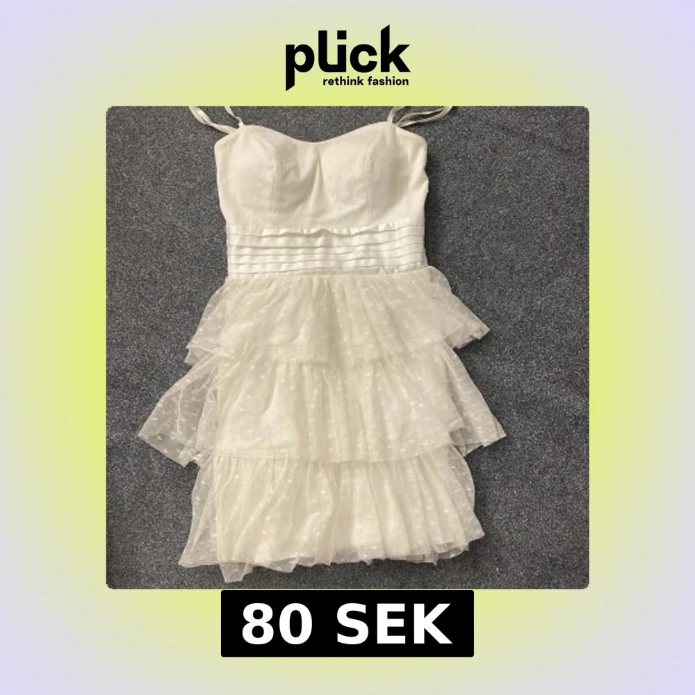 Charmig vit klänning med smala axelband och flera lager av volanger i kjolen. Den har en tight passform upptill och ett prickigt mönster på volangerna. Köpt från bikbok!