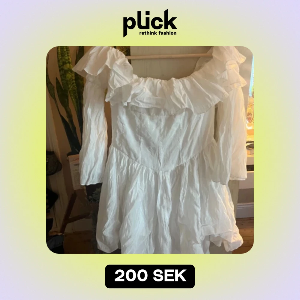 En vit klänning med volanger och långa ärmar. Klänningen har en offshoulder-design och är tillverkad i ett lätt och luftigt material.