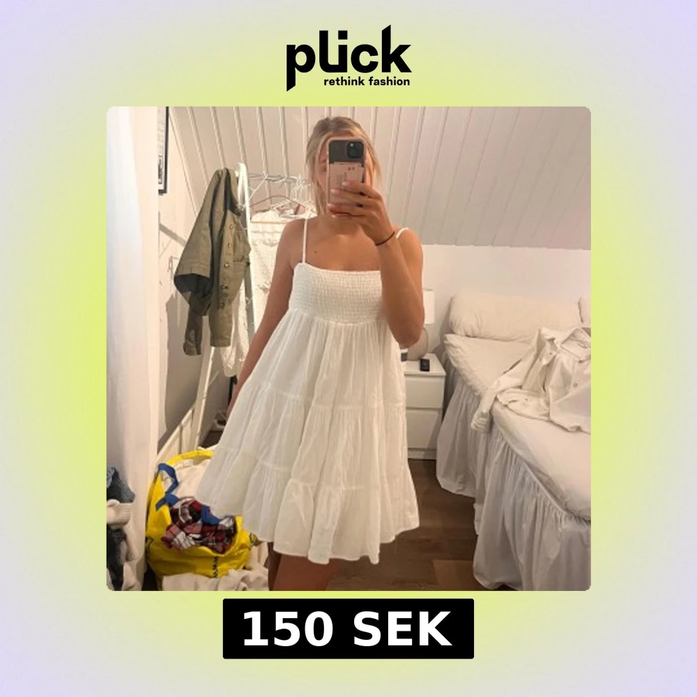 Säljer en söt vit klänning med smala axelband och volangdetaljer. Perfekt för sommardagar med sin luftiga design och sköna passform. Klänningen har en smockad överdel som ger en fin siluett.