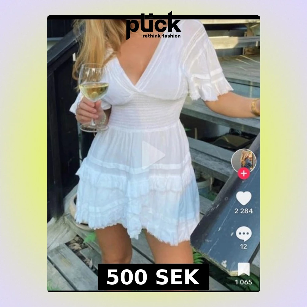 Superfin vit kort klänning med omlott och v-ringning. Klänningen har volangdetaljer, korta ärmar och markerad midja i resår. Perfekt för varma dagar och ger en romantisk känsla med sitt lätta bomullstyg och flowiga fall. Jag misstänker att en söm gått upp på ärmen men det var så jag köpte den, kan skicka bild vid intresse. Annars superfin och perfekt studentklänning!