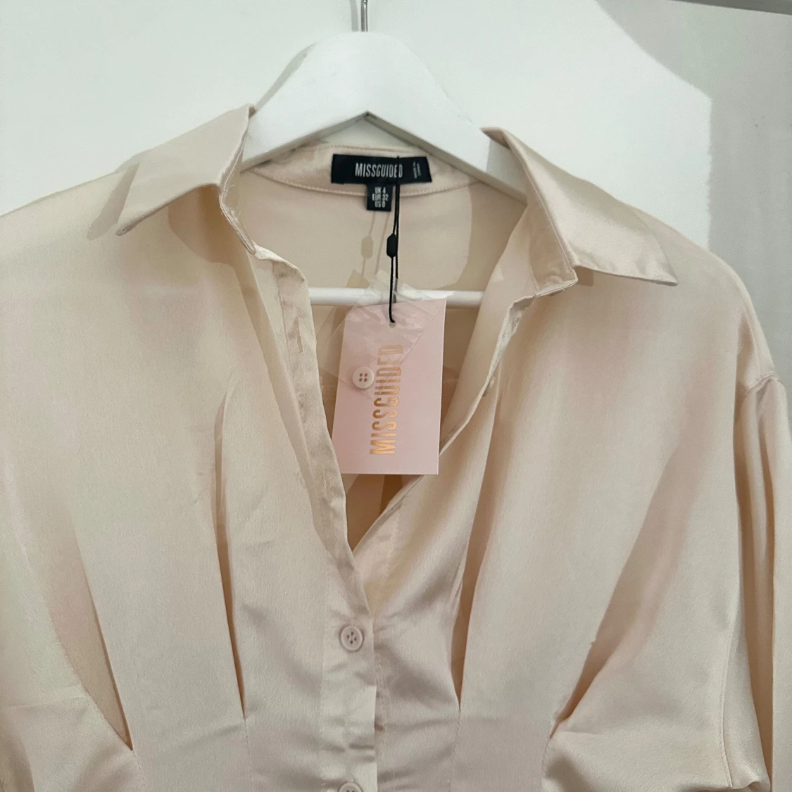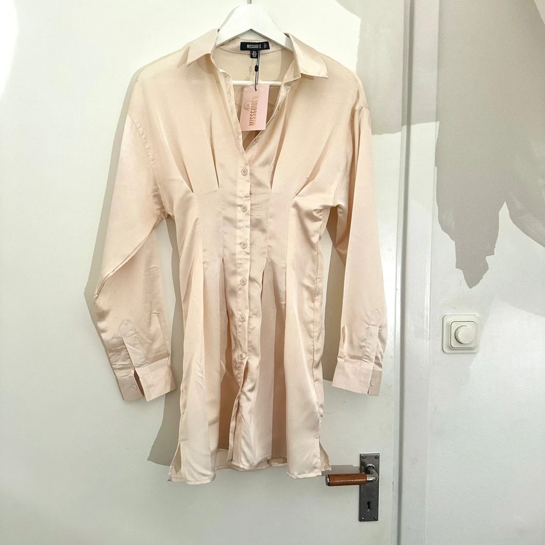 Vit/champangefärgad klänning från Missguided. Aldrig använd. Prislapp och extra knappar ingår. Fint glänsande satintyg.