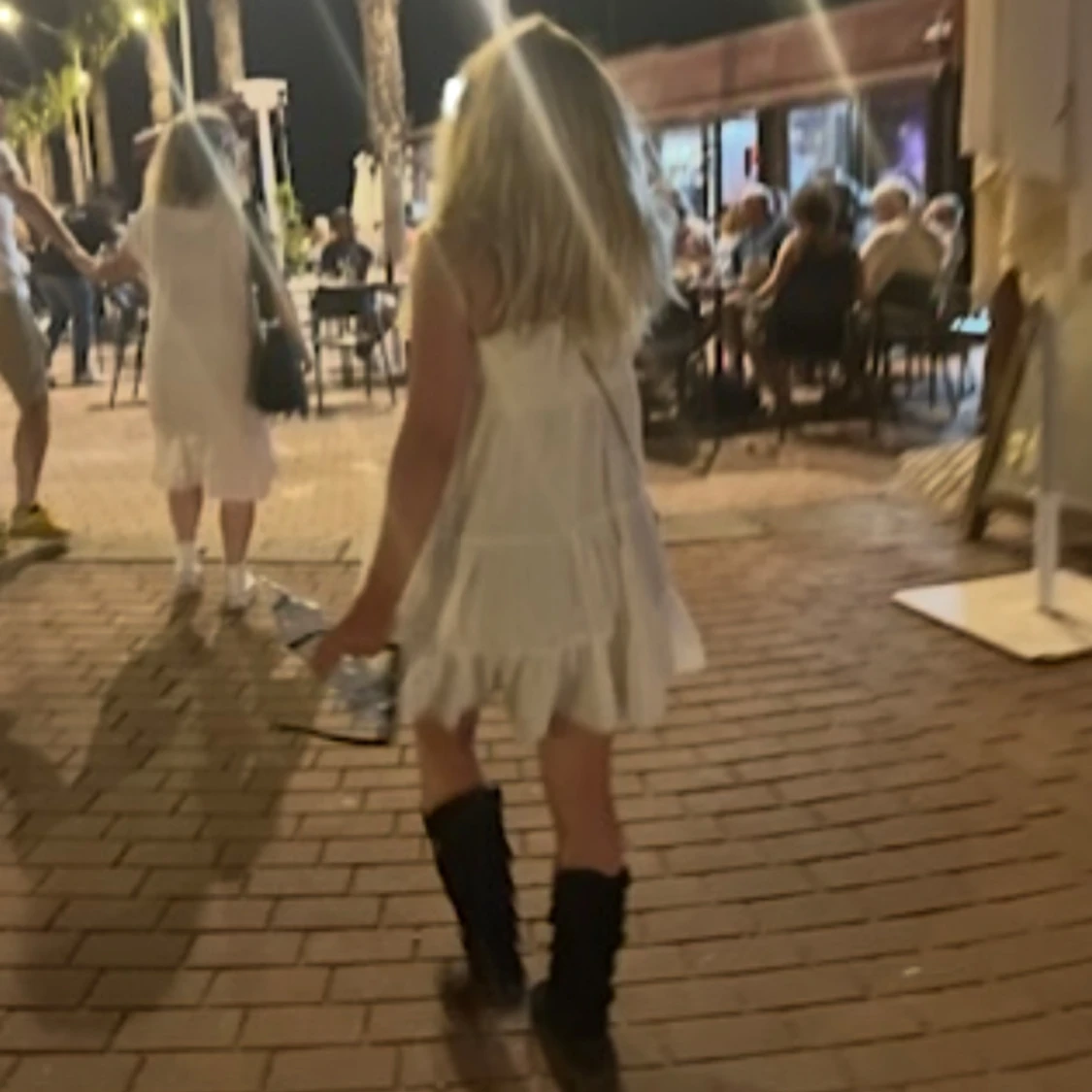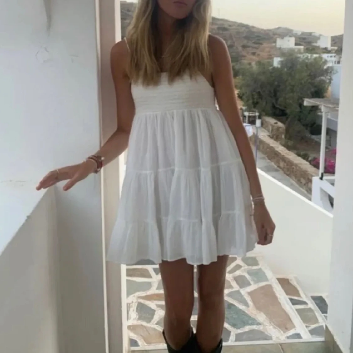 Supersöt vit kortklänning med tunna axelband och volanger i flera lager. Klänningen har en luftig och flowy passform som ger en chill vibe, perfekt för varma dagar. Materialet känns lätt och fräscht, och den är ärmlös för en somrig look.