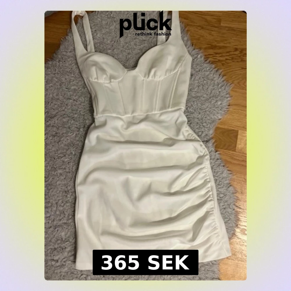 Snygg vit kort klänning med markerad byst. Klänningen har draperad detalj på sidan och figurnära passform. Perfekt för dig som vill ha en stilren och trendig look. Materialet känns mjukt och stretchigt. Klänningen är i storlek M men passar mig som brukar ha på mig storlek S och Xs.