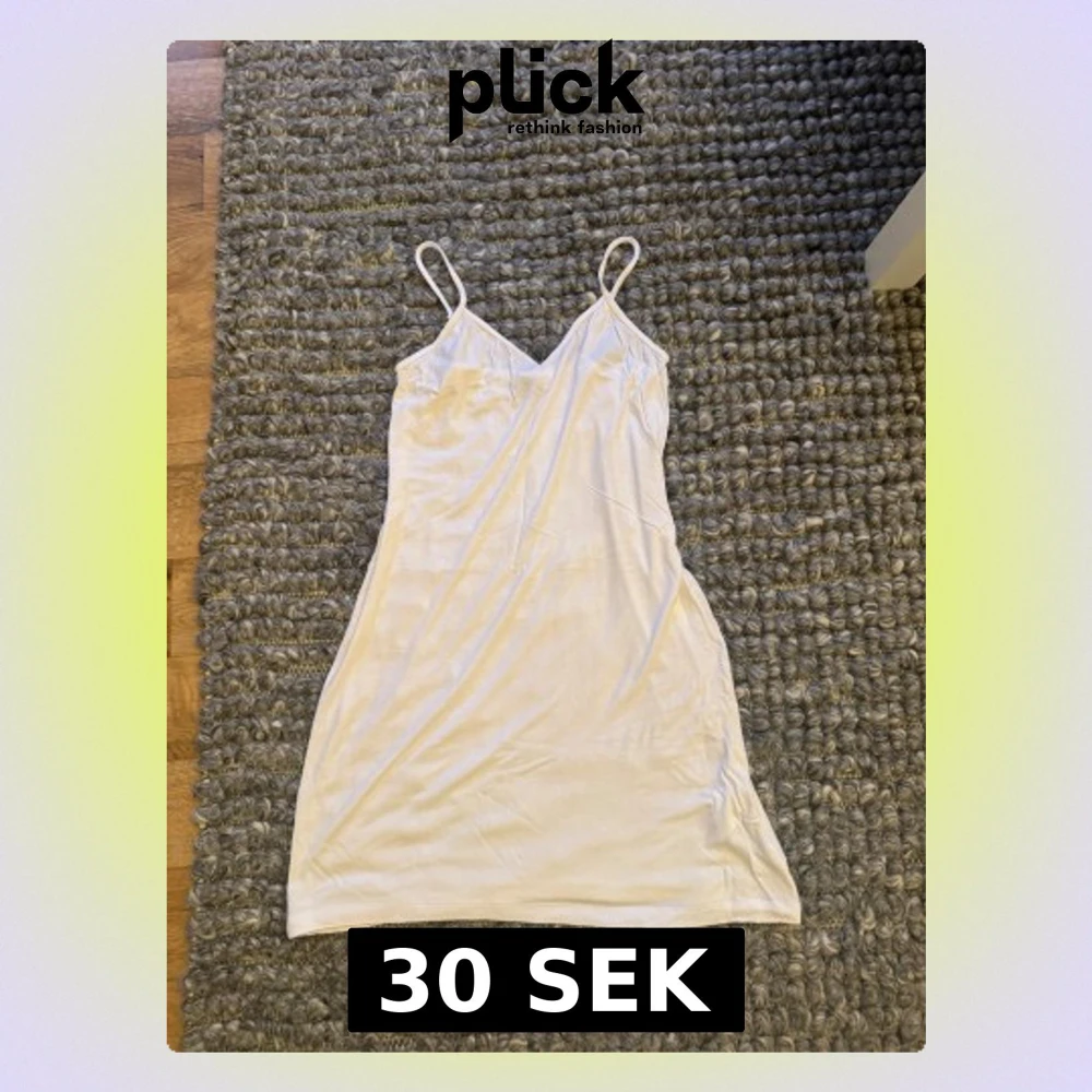 Säljer en vit, enkel och stilren kort klänning från Gina Tricot i storlek M. Klänningen har smala axelband och v-ringad hals, vilket ger en snygg och feminin look. Materialet är mjukt och känns skönt mot huden, perfekt för varma dagar.