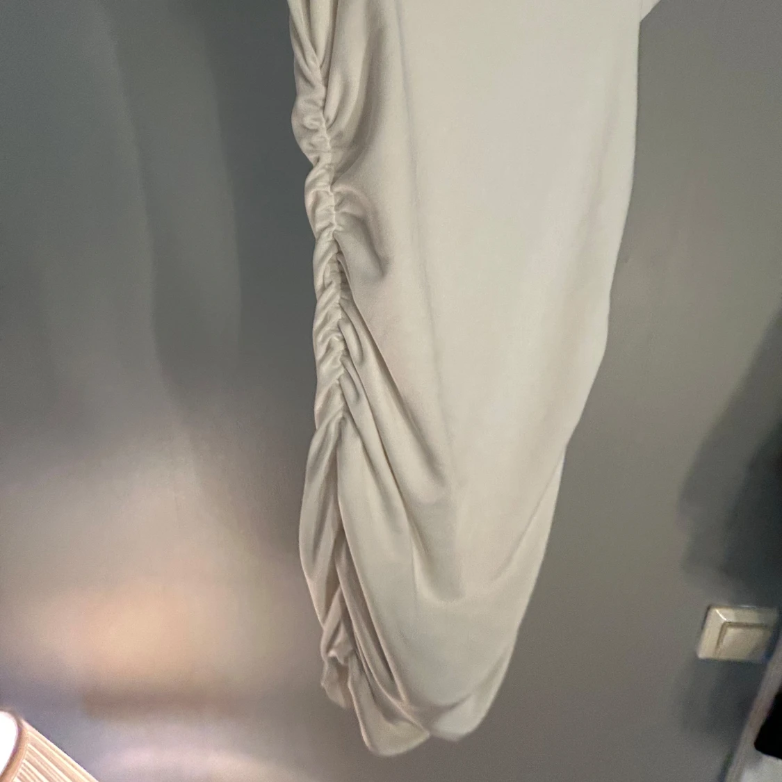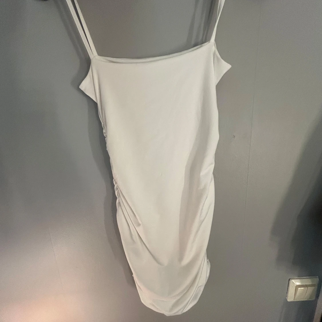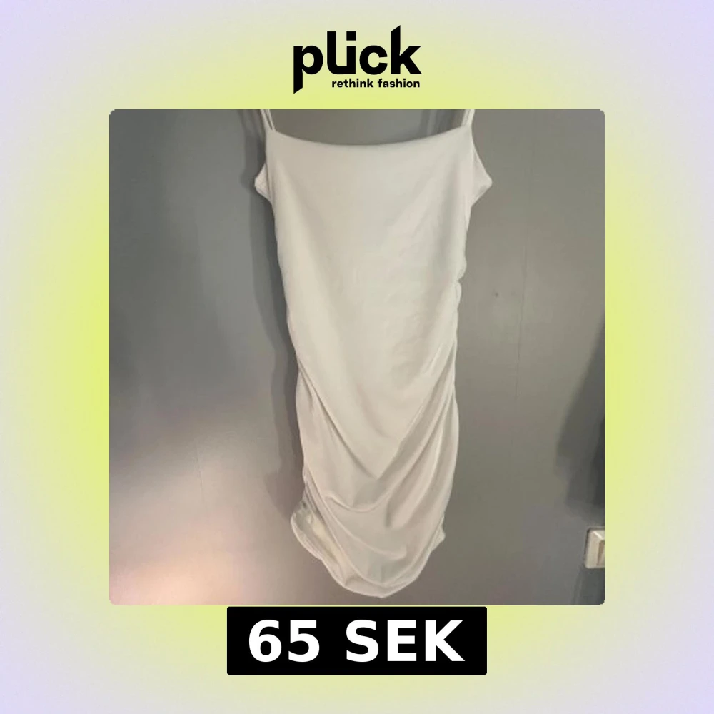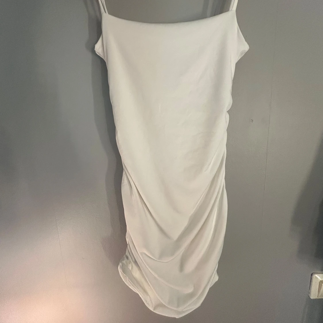 Säljer en stilren vit klänning med smala axelband och snygg drapering längs sidan. Klänningen är figurnära med en elegant, enkel design. Perfekt för dig som gillar minimalistisk stil. Helt oanvänd!💓