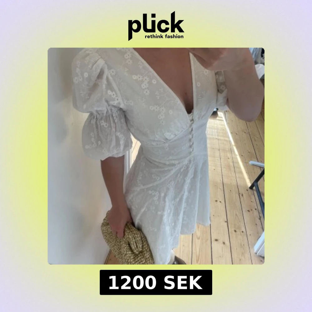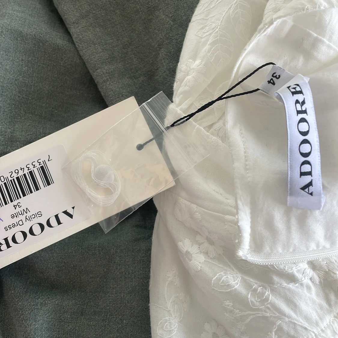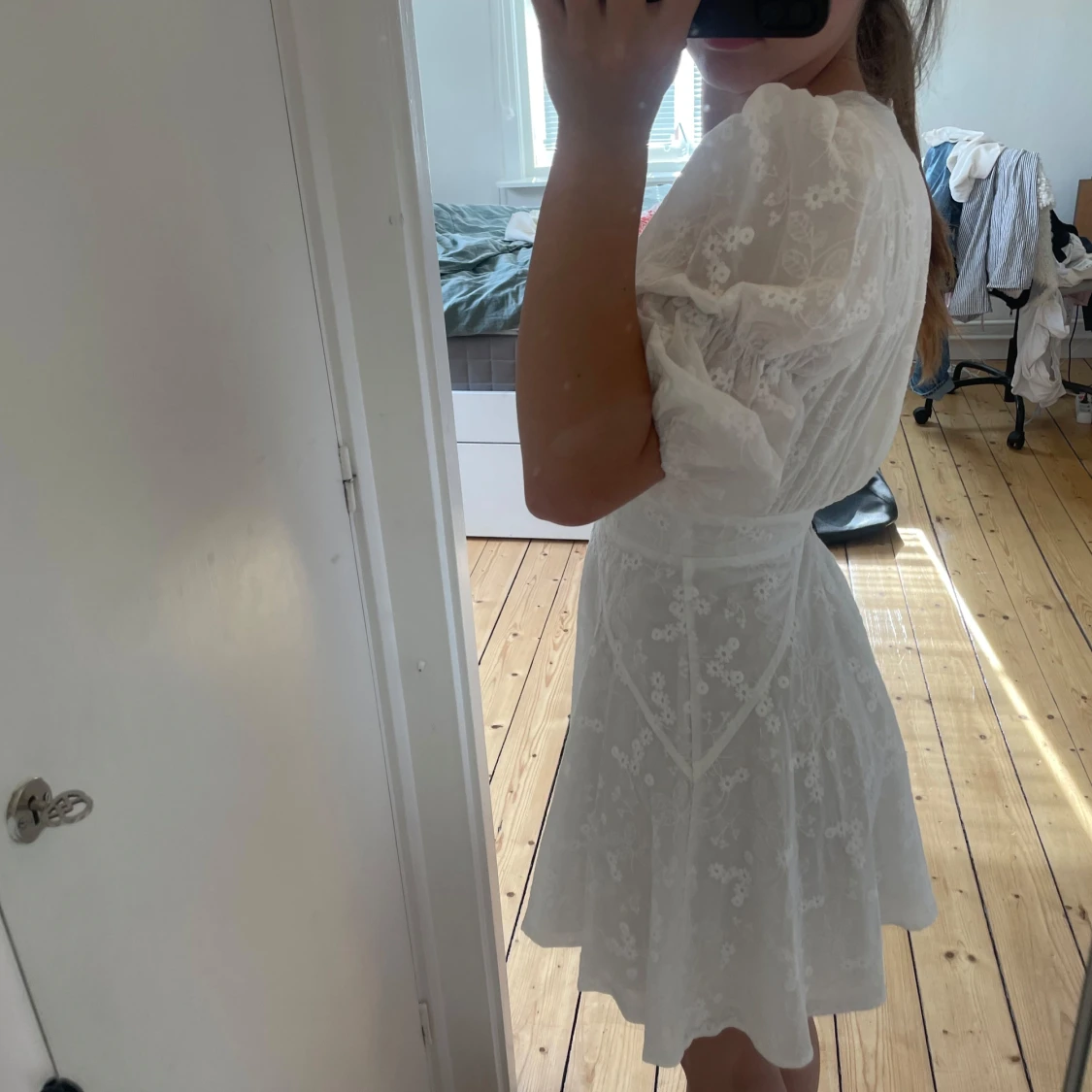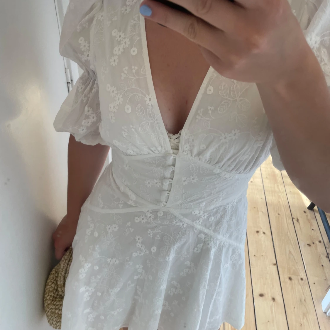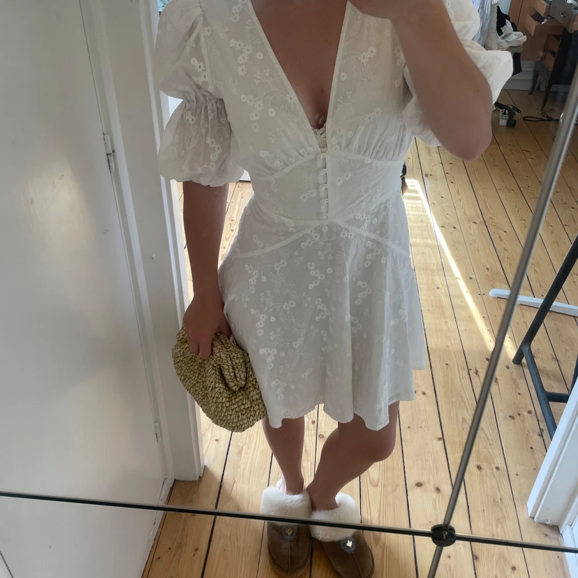 Superfin vit kort klänning med broderade blommor, puffiga korta ärmar och djup v-ringning. Klänningen har knappar framtill och markerad midja som ger en snygg siluett. Perfekt för sommarens alla tillfällen!