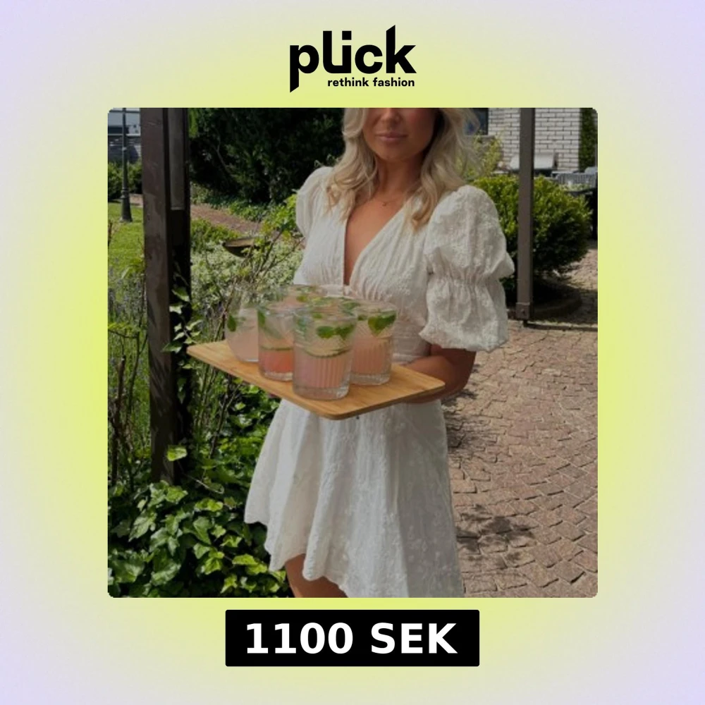 Superfin vit kort klänning med broderade blommor, djup v-ringning och puffiga korta ärmar. Klänningen har markerad midja, knappar framtill och lätt utsvängd kjol. Perfekt för sommarens alla tillfällen! Använd 2 gånger.