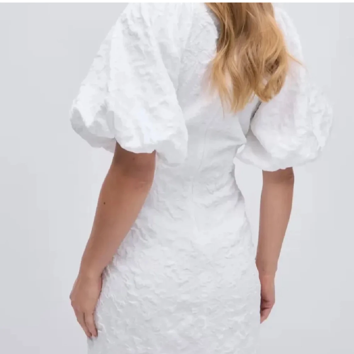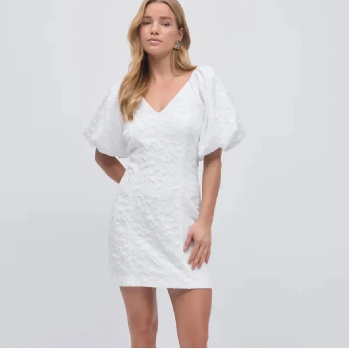 Superfin vit kort klänning med v-ringning och stora puffärmar. Andvänt 1 gång
