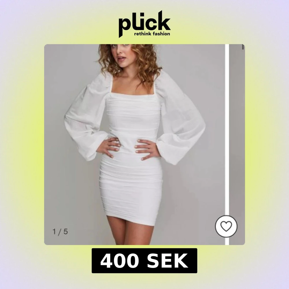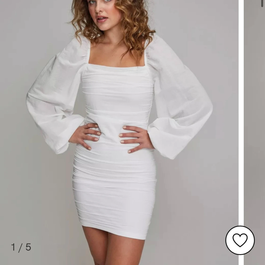 Elegant vit kort klänning med långa puffärmar och en tight passform. Klänningen har en fyrkantig urringning och är tillverkad i ett mjukt material som ger en smickrande silhuett. Skriv om fler bilder