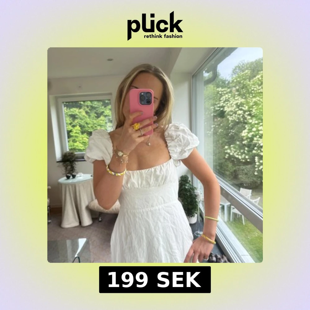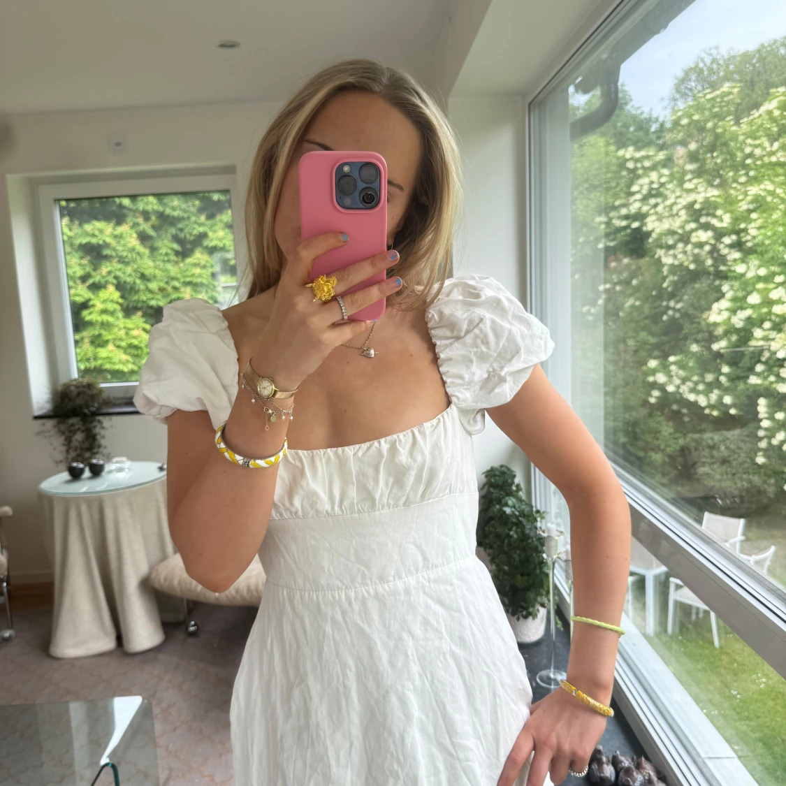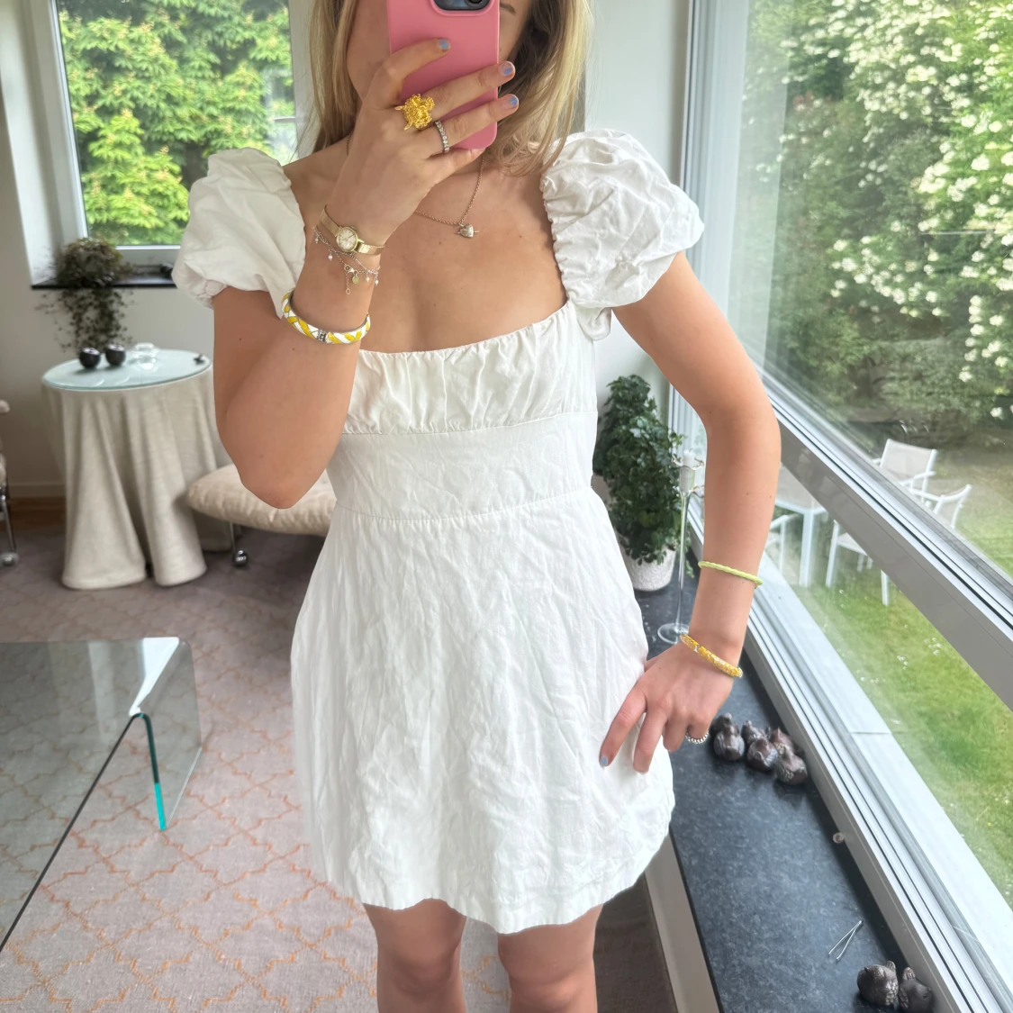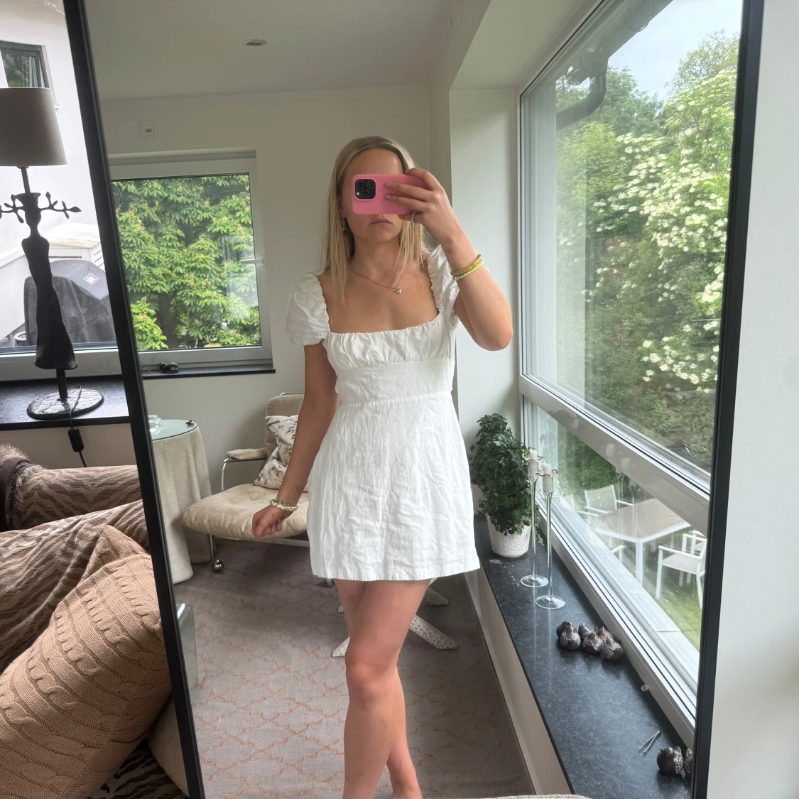 Superfin vit kort klänning med puffärmar och fyrkantig urringning. Öppen rygg med snörning som ger en snygg detalj. Klänningen har en lätt A-linjeform och är gjord i ett tunt, somrigt tyg. Perfekt för varma dagar och ger en romantisk vibe.