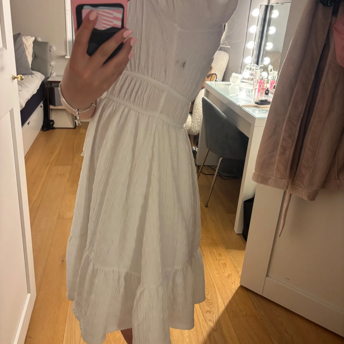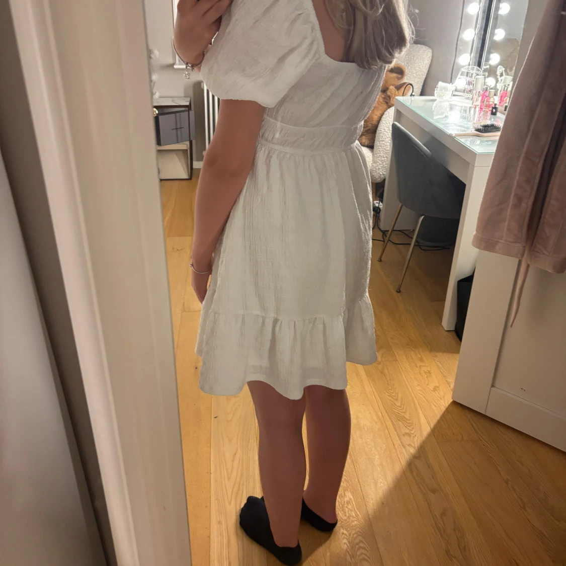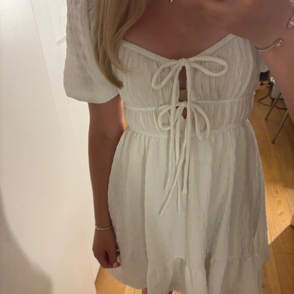Superfin vit kort klänning med puffärmar och två snörningar framtill. Klänningen har en lätt rynkad struktur och volang nertill, vilket ger en söt och somrig känsla. Klänningen har en liten fläk unde armen men den syns inte så mycket eftersom armen är där. Skriv vid frågor!❤️
