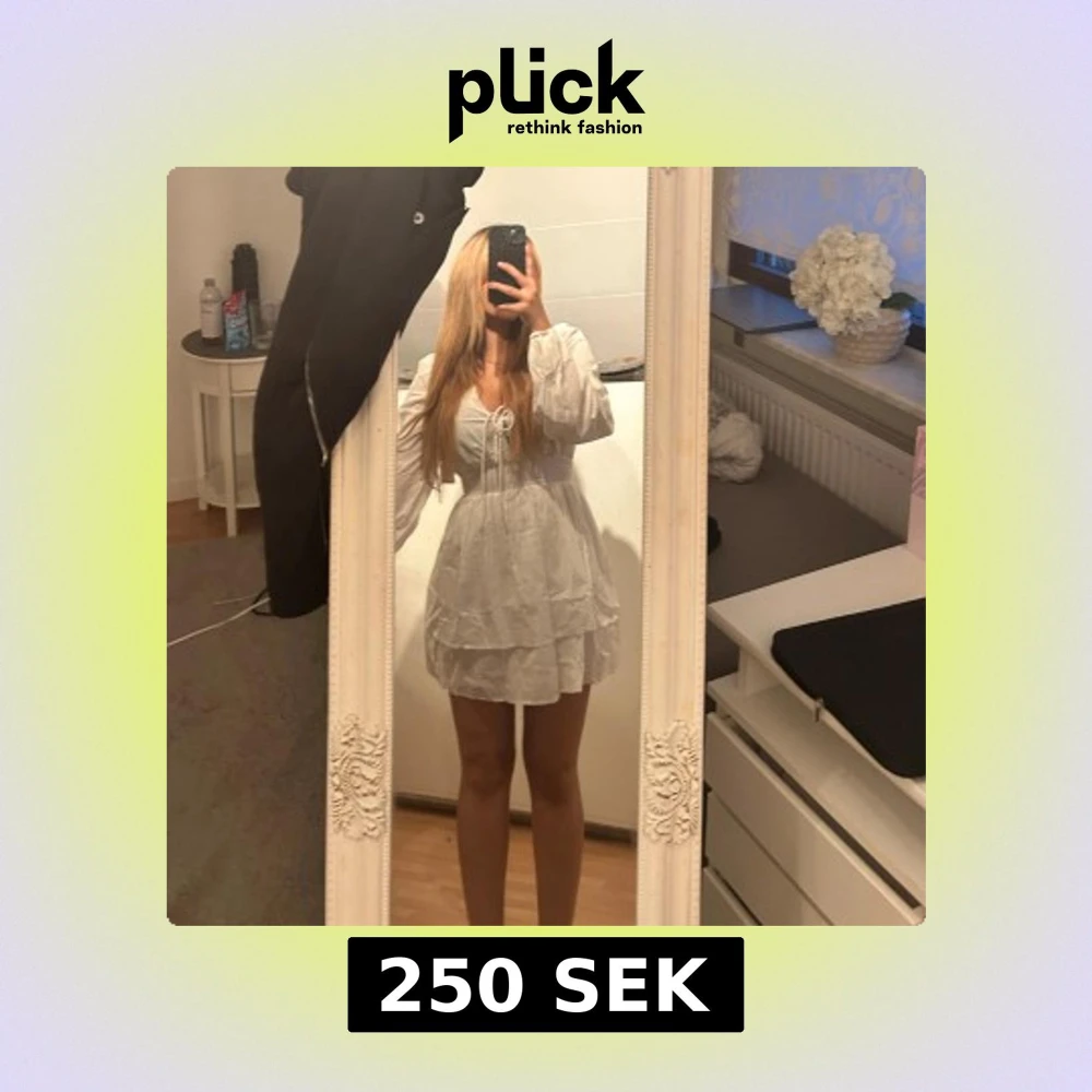 Supersöt vit kort klänning från Nelly med långa puffärmar, knytning framtill. Fin till sommarn och en perfekt studentklänning. Hade precis köpt den men är för tight. Provad som ni ser endast för bilden. Prislappen sitter kvar. Lär strykas