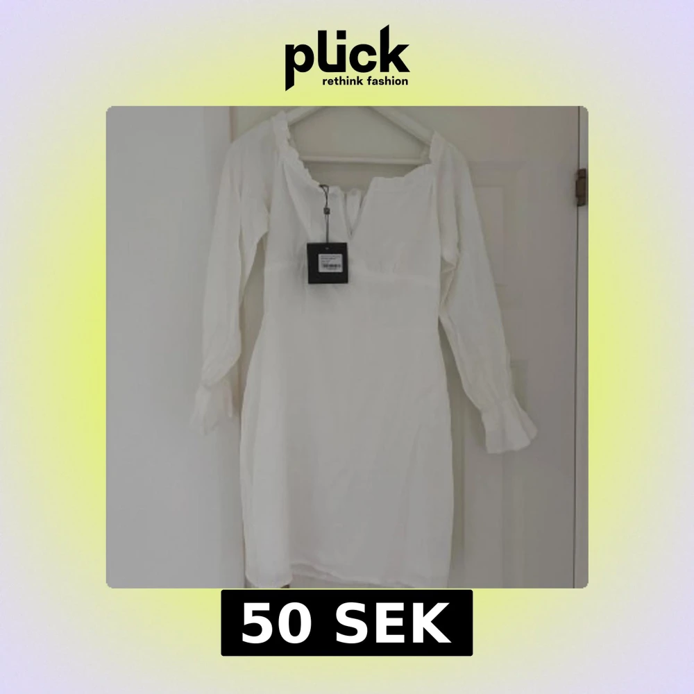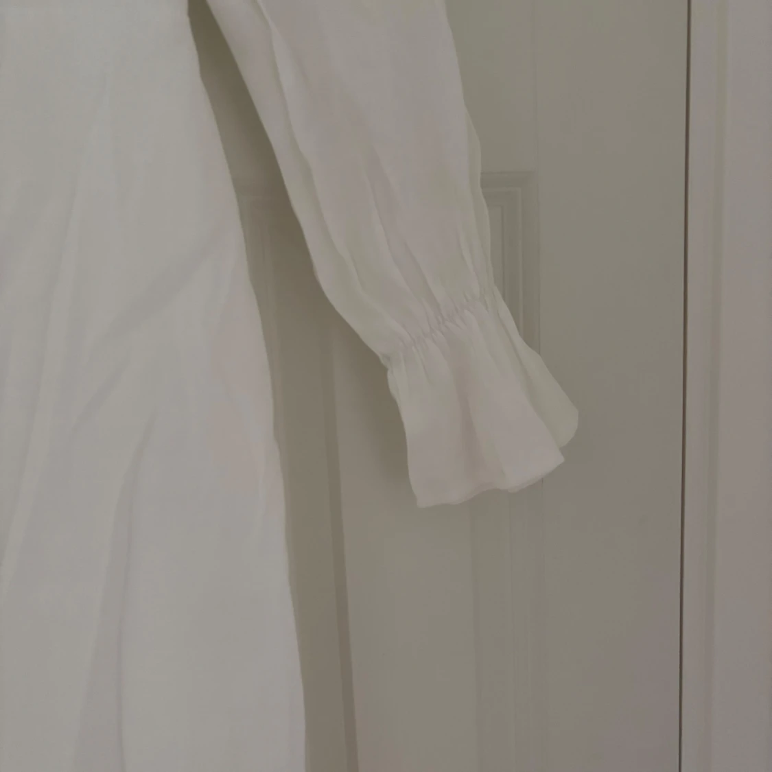 Säljer en vit kort klänning med långa ärmar och volangdetalj vid ärmslut. Klänningen har en lätt rynkad kant vid halsen och en liten öppning framtill. Perfekt för dig som gillar en clean och fräsch look med romantiska detaljer.