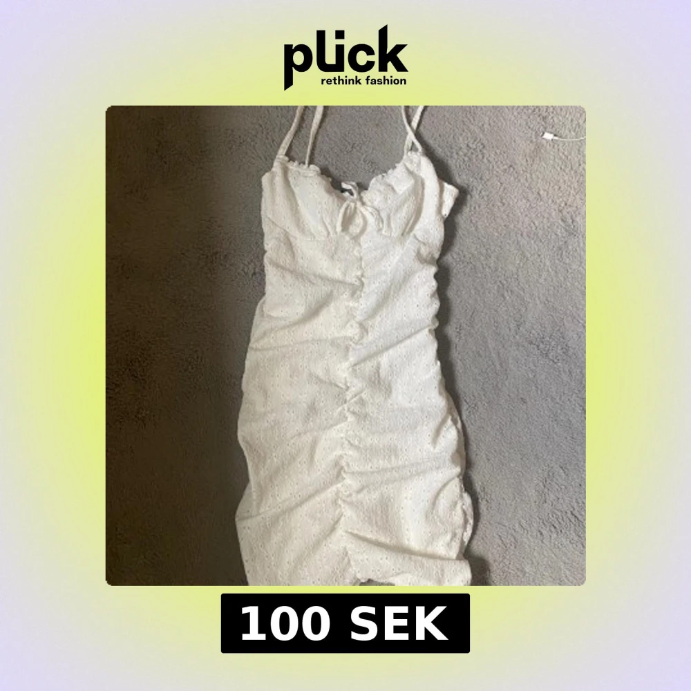 Supersöt vit kort klänning med smala axelband, broderade detaljer och knyt framtill. Klänningen har en feminin passform med rynkade sömmar längs mitten och är perfekt för varma dagar.