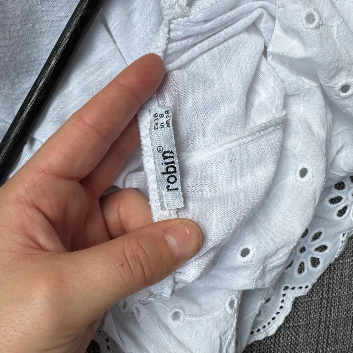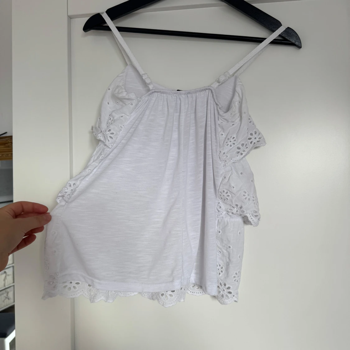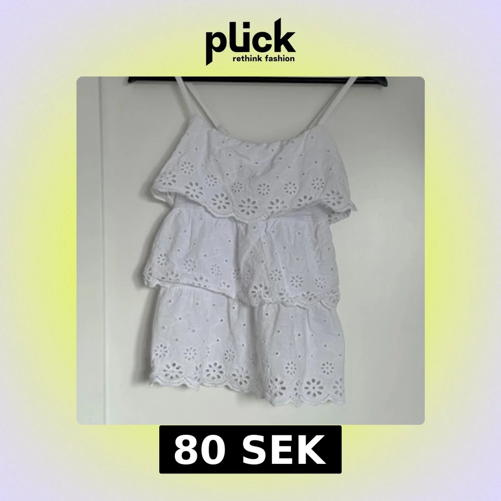 Supersöt vit topp från Robin med smala axelband och broderade blommor i spets. Klänningen har volangdetaljer och är tillverkad i mjuk bomull, perfekt för varma dagar. Den är kort och har en luftig passform som ger en chill vibe.