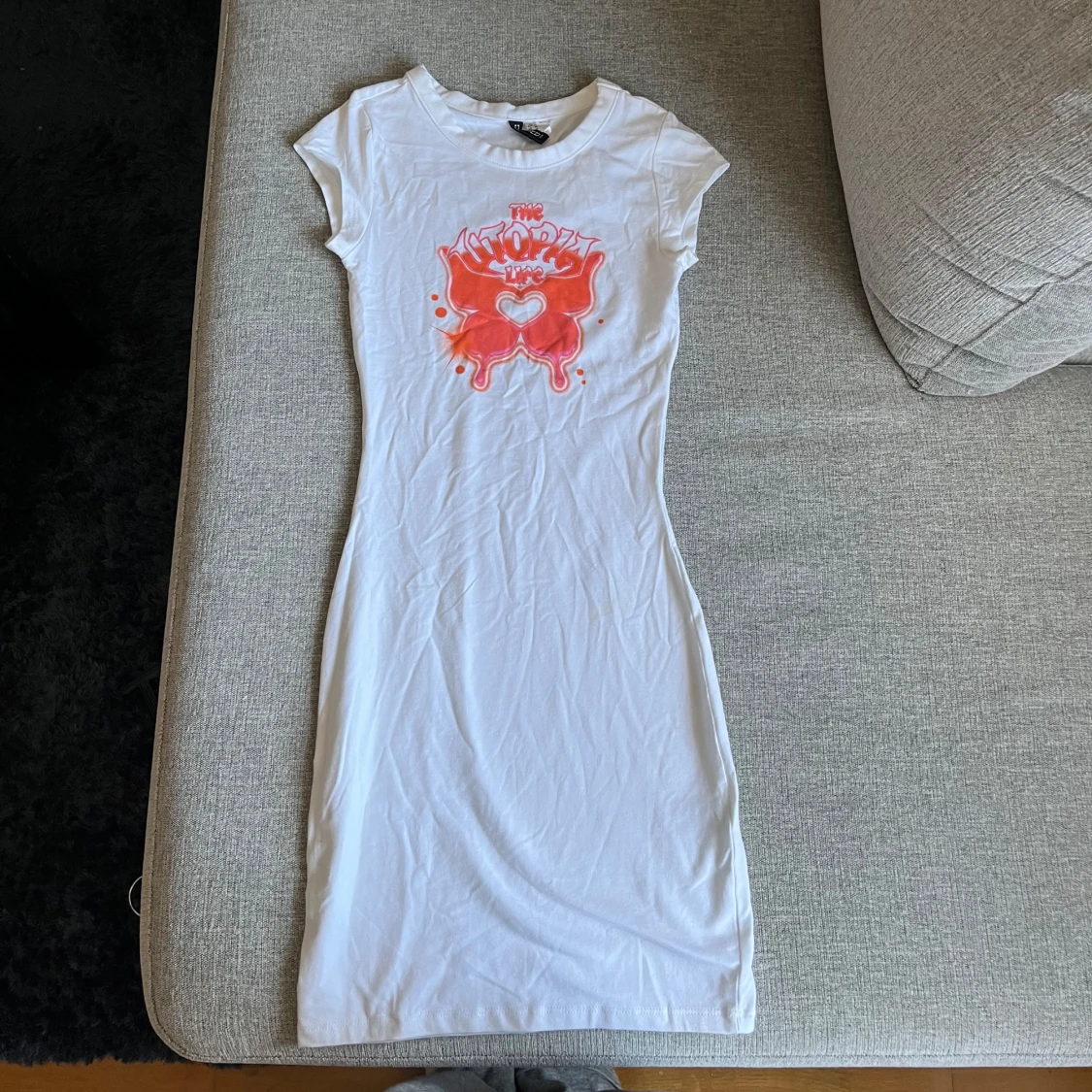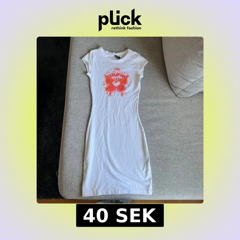 Vit figurnära kortklänning från H&M Divided i storlek XS. Klänningen har korta ärmar och ett tryck framtill i rött och rosa med text och hjärtdetalj. Tillverkad i mjuk bomull och är ungefär till knäna beroende på hur lång man är. Aldrig använd endast testat på.