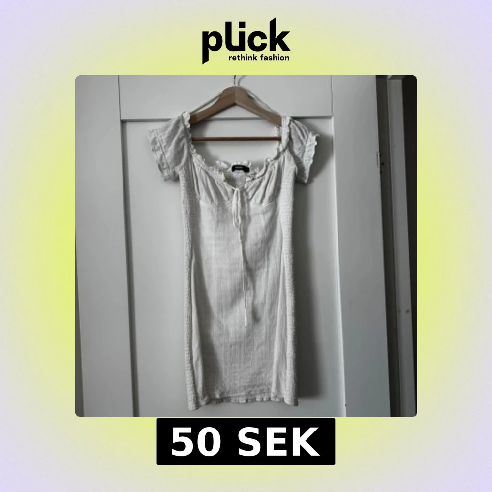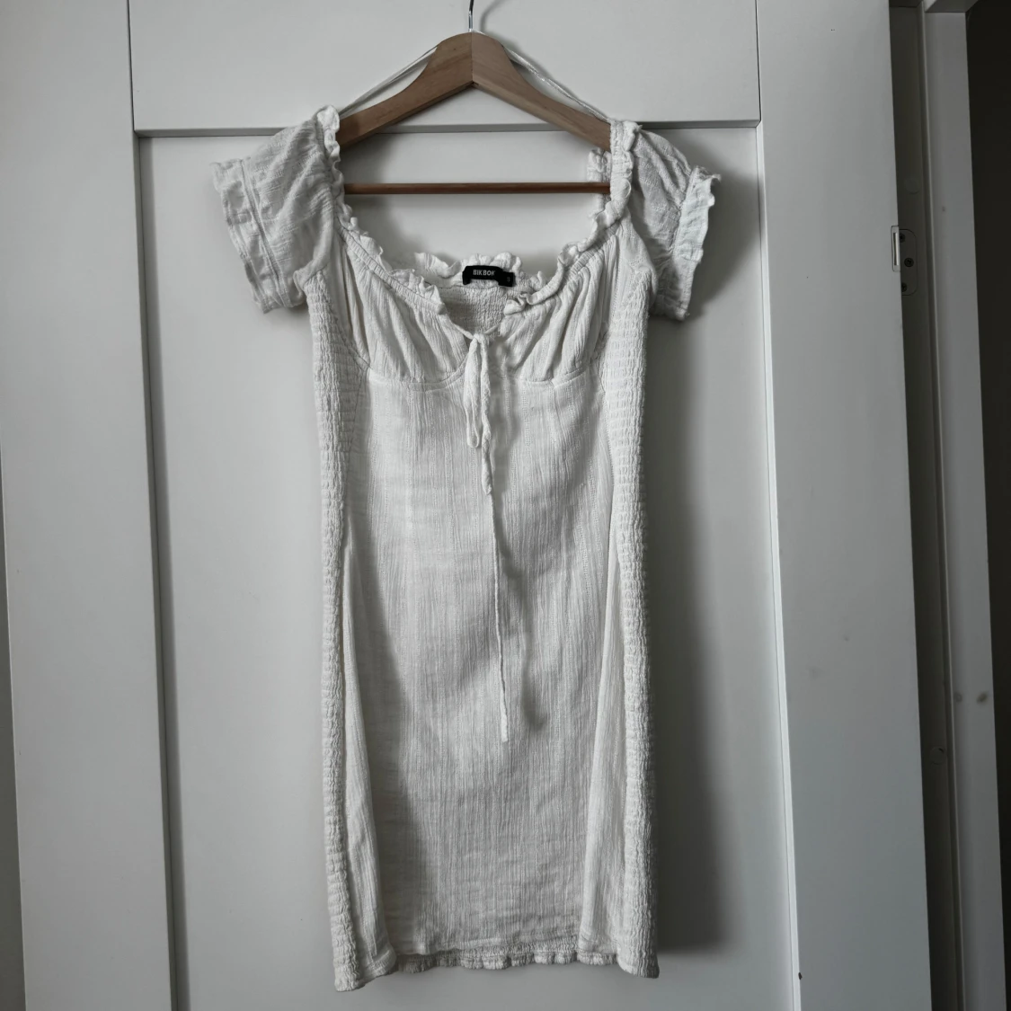 Supersöt vit kortklänning från Bik Bok med puffärmar och smockad struktur. Klänningen har knytning vid bysten och volangdetaljer vid ärmslut och halsringning. Perfekt för sommarens alla tillfällen!