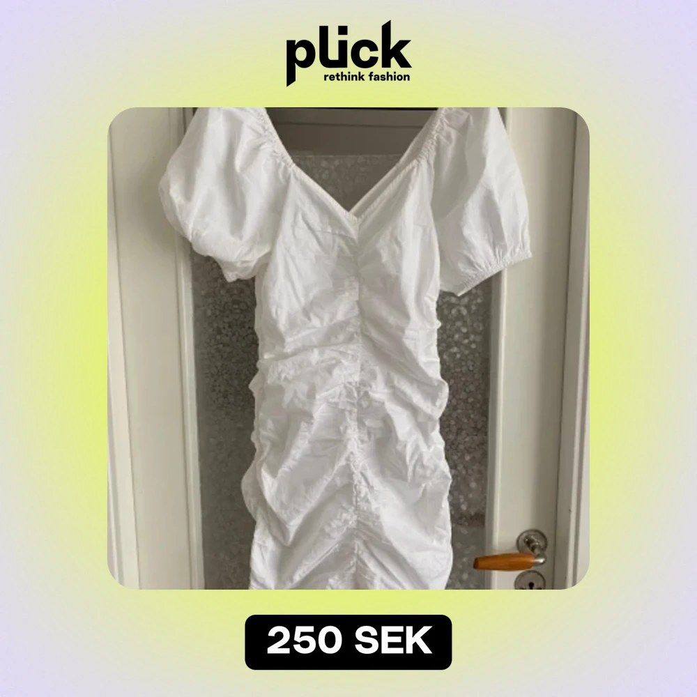 Säljer en superfin vit kortklänning med puffärmar. Klänningen har en v-ringad hals och är rynkad längs hela framsidan vilket ger en snygg och smickrande passform. Perfekt för sommarens alla fester och tillfällen! 💖