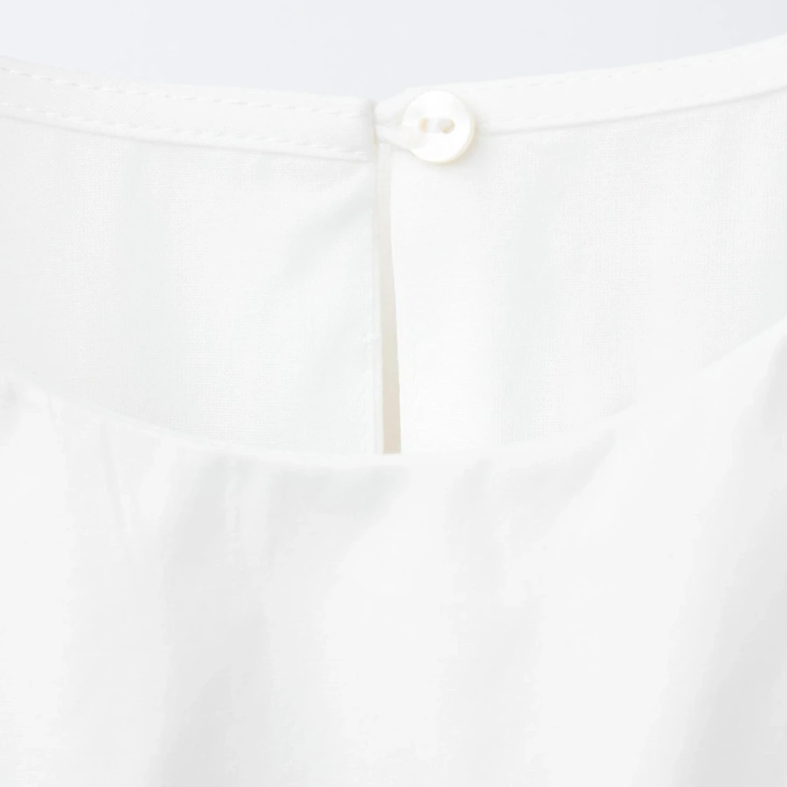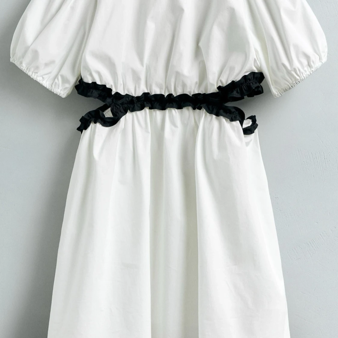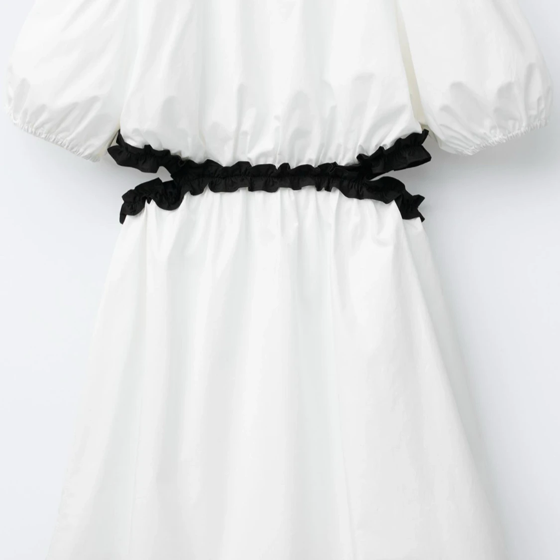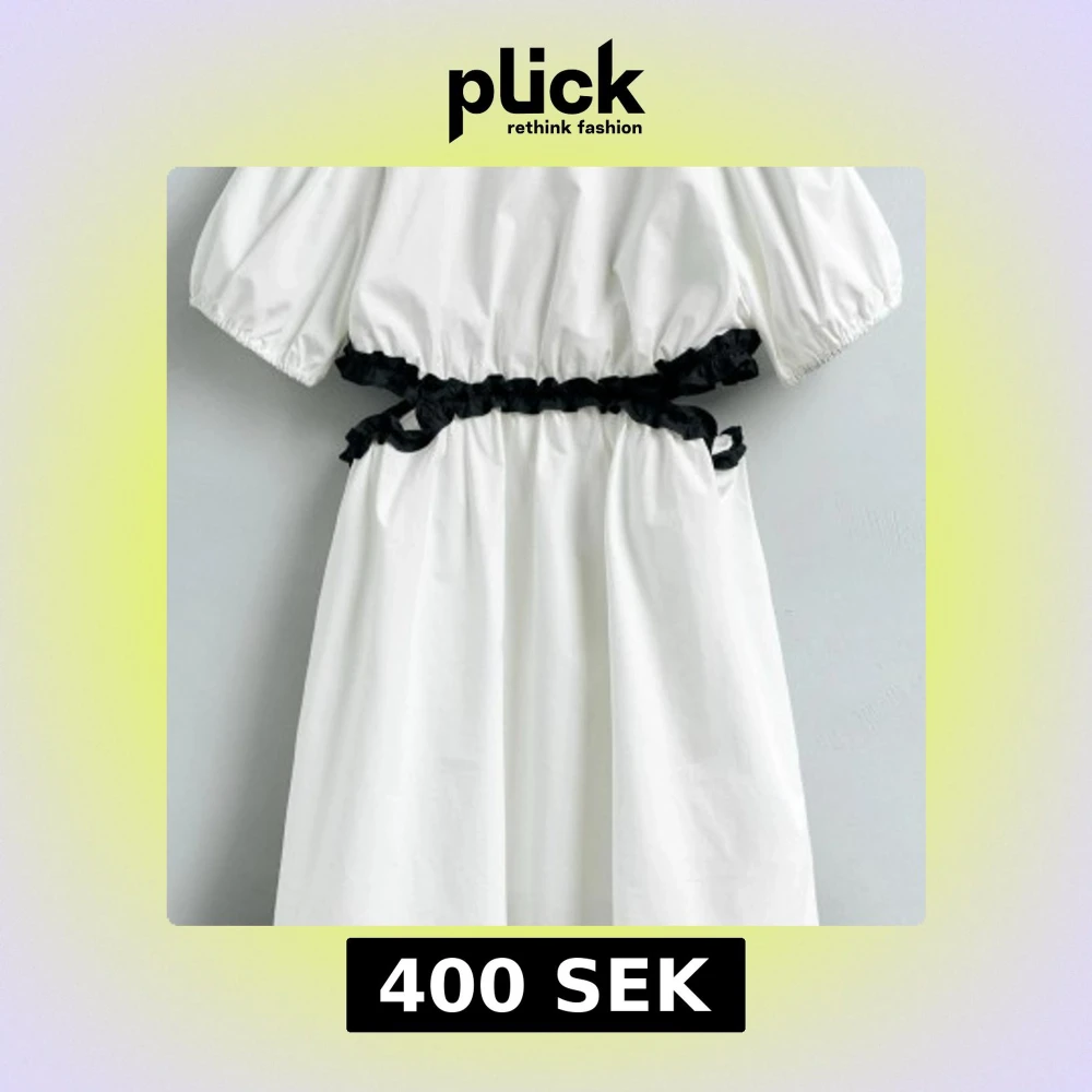 Supersöt vit kortklänning med puffärmar och svarta volangdetaljer runt midjan. Klänningen har en luftig passform och knäpps med en knapp i nacken🥰🥰🥰storlek 164 men passar s & prislapp kvar