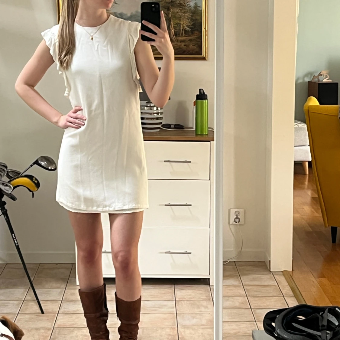 Supersöt vit klänning med dubbla lager så inte alls genomskinlig. Står storlek 38 på lappen men passar mindre också. Finns möjlighet att mötas upp i Stockholm 🩰🤍