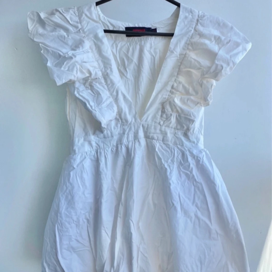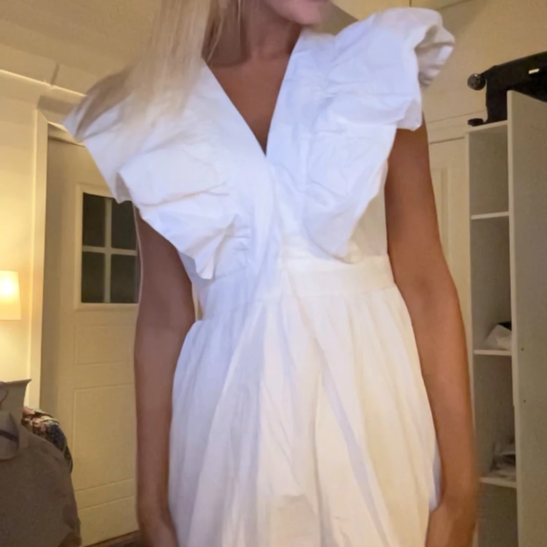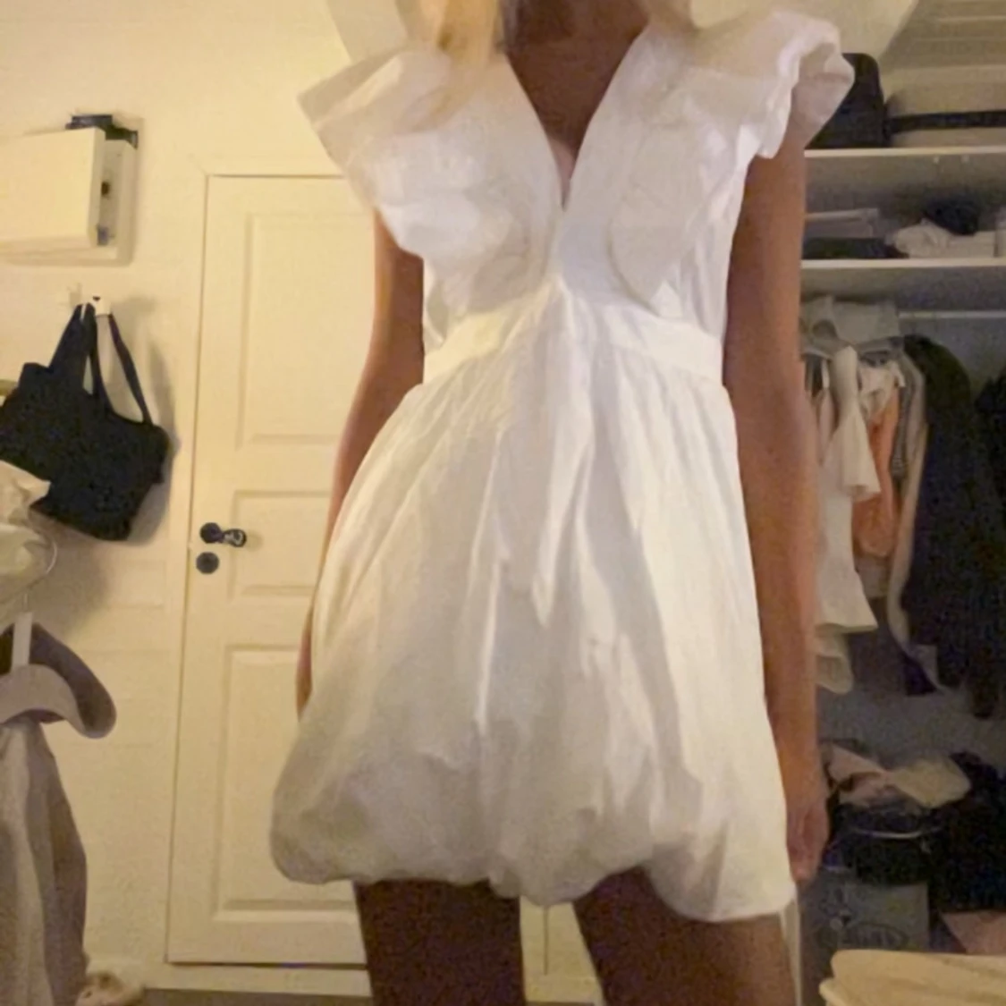 Superfin vit kortklänning med djup v-ringning och stora volangärmar. Skriv för frågor, använd gärna köp nu💗💗