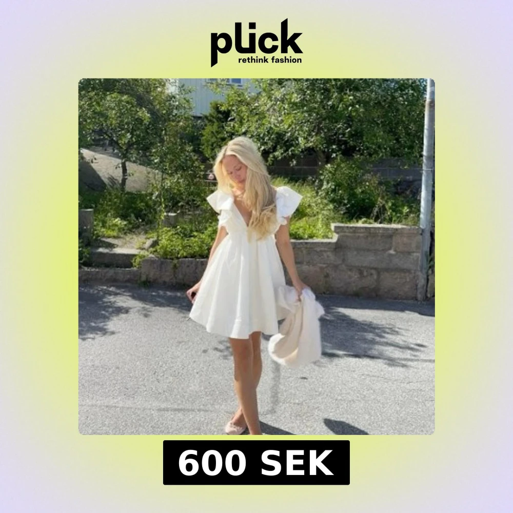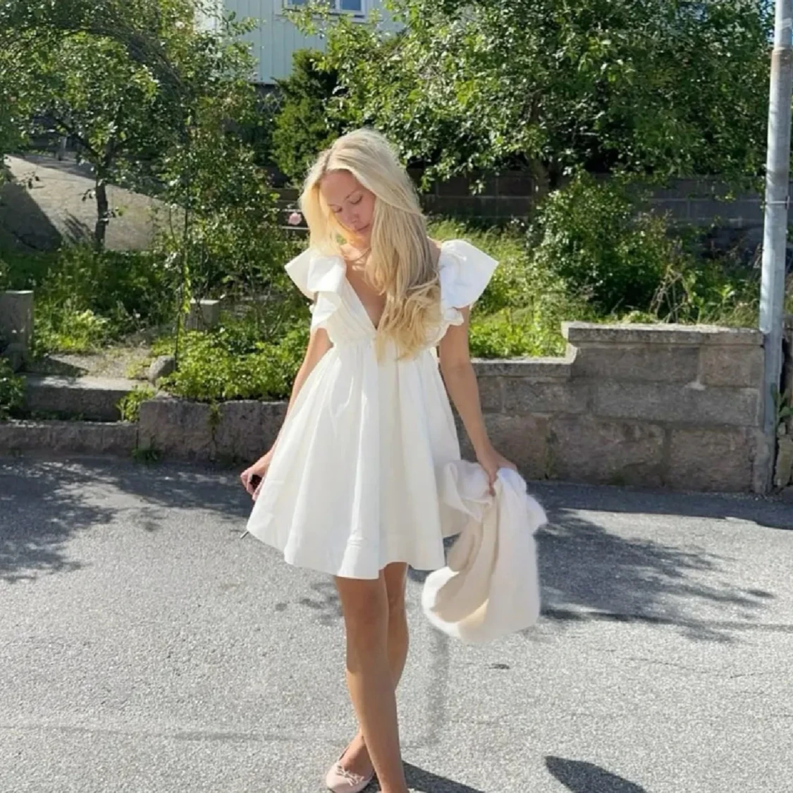 Koller intresset på min supersöta vita kortklänning med djup v-ringning och volangärmar. Klänningen har en luftig passform och är perfekt för varma dagar!! 🍓❣️(Lånad bild). Skriv gärna i DM för fler bilder på självaste klänningen❤️🩹