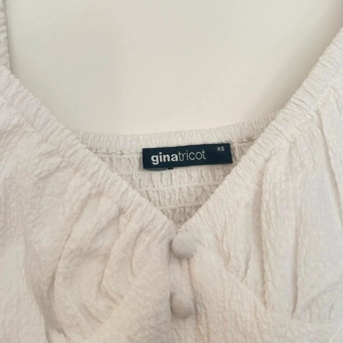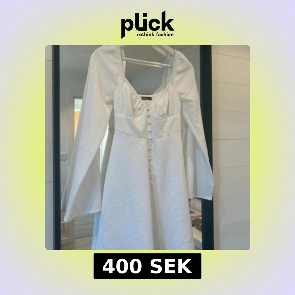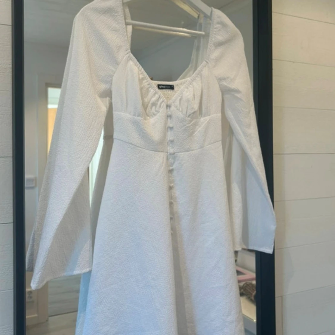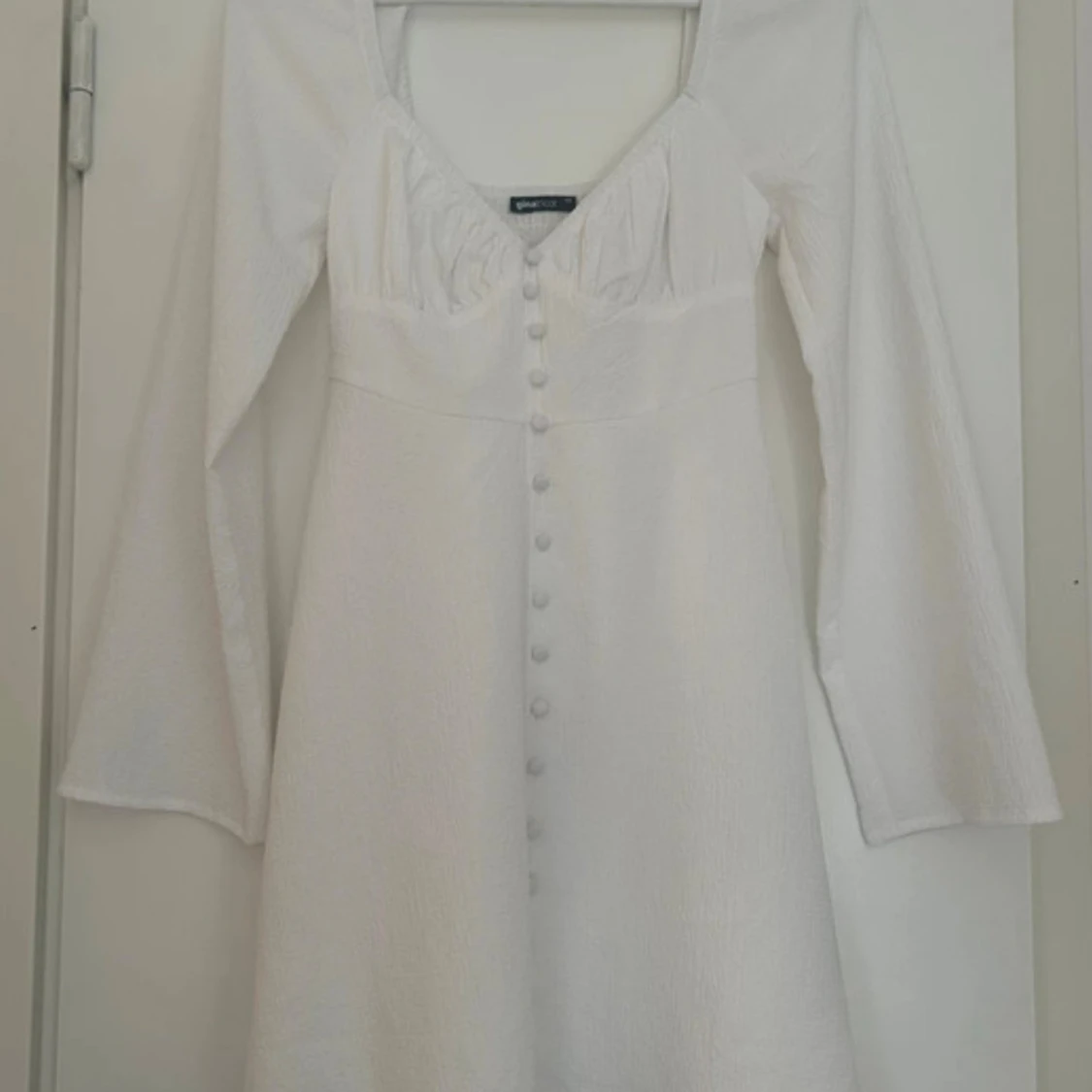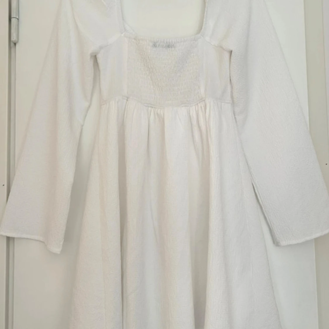 Supersöt vit klänning från Gina Tricot med lång ärm, markerad midja och knappar framtill. Klänningen har en lätt strukturerad yta, fyrkantig ringning och smock i ryggen för extra komfort. Perfekt för dig som gillar romantisk och stilren look. Endast använd en gång. Finns inte att köpa längre.