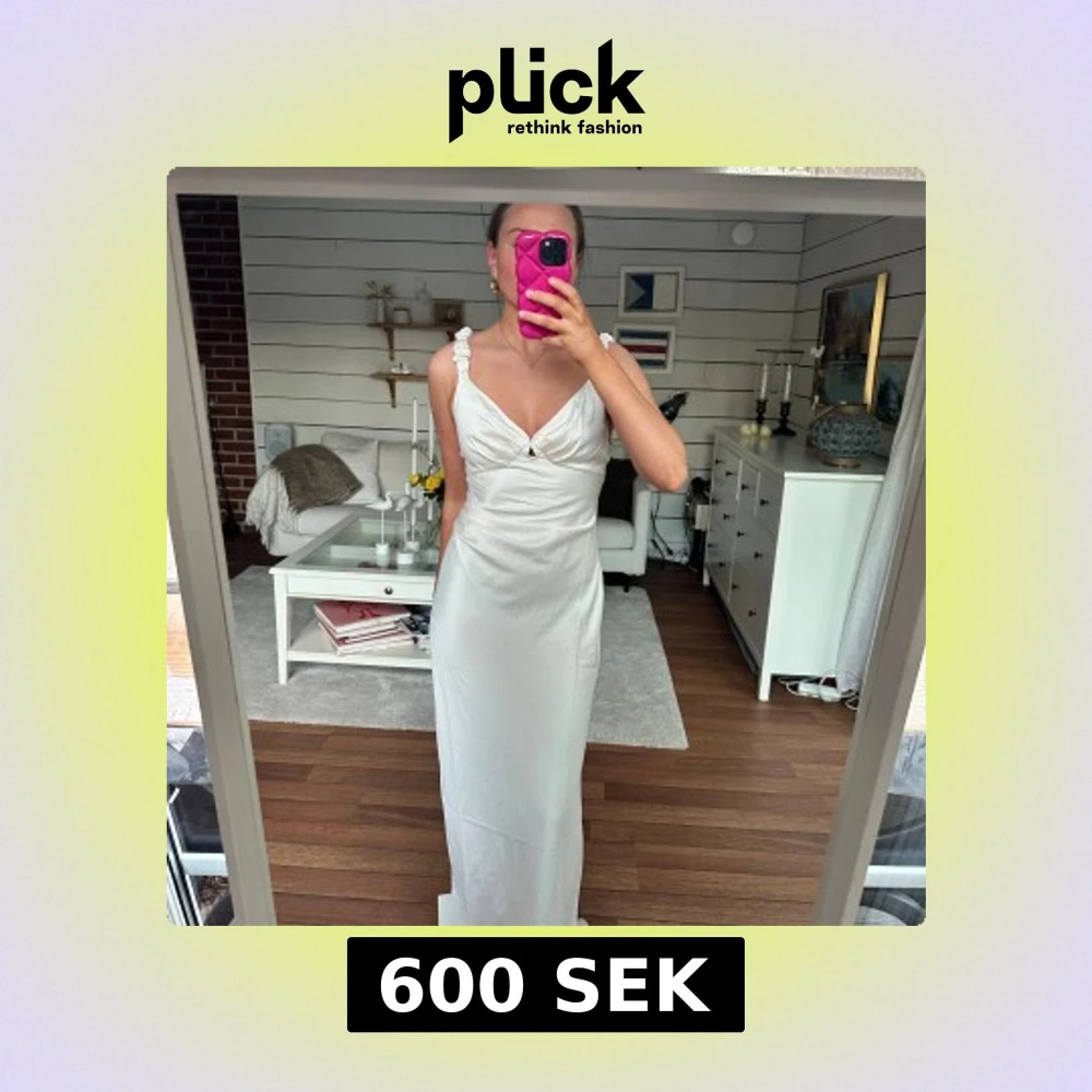 Elegant vit långklänning med smala axelband och volangdetaljer. Klänningen har en v-ringad design och en åtsittande passform som framhäver figuren. Perfekt för speciella tillfällen. Klänningen är helt ny och enbart provad.