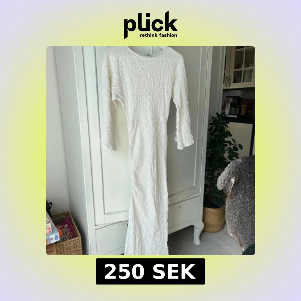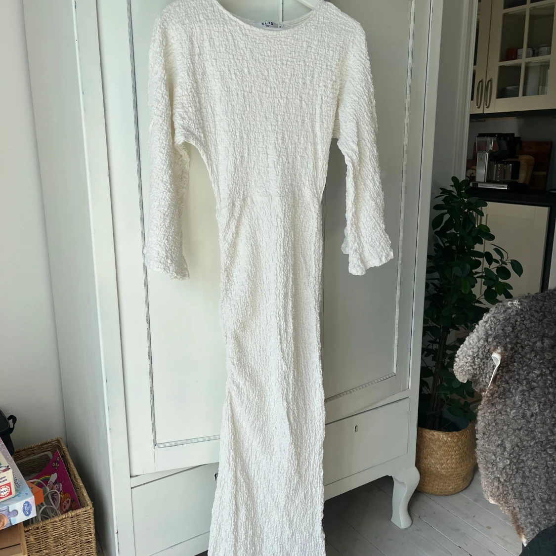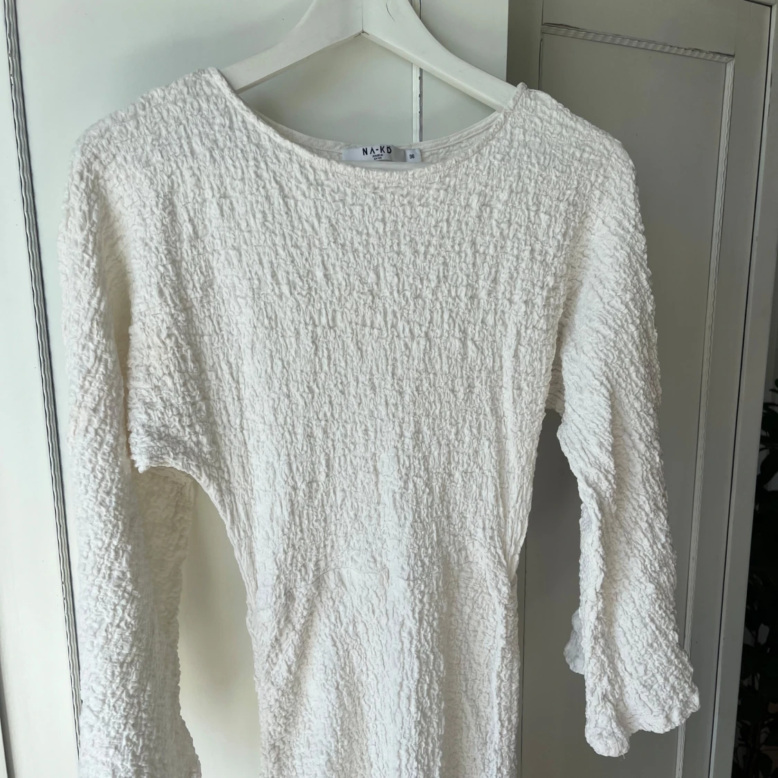 Superfin vit långklänning från NA-KD med strukturerat tyg och långa ärmar. Klänningen har en snygg snörning i sidan och en figurnära passform. Använd ungefär 2 gånger!🩷🩷