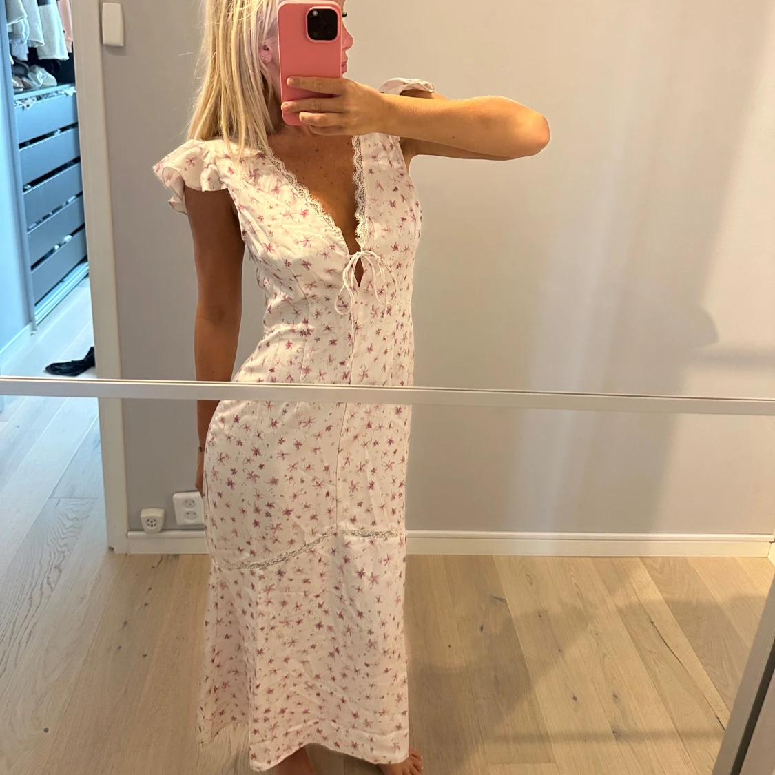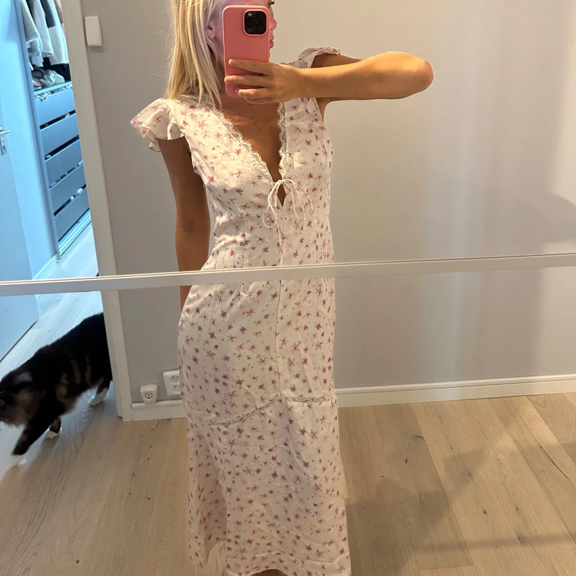 Supersöt långklänning i vit med små rosa blommor, volangärmar och v-ringning med spetskant och knyt framtill. Klänningen har en romantisk vibe och är perfekt för varma dagar. Lätt och luftig modell som ger en avslappnad känsla.