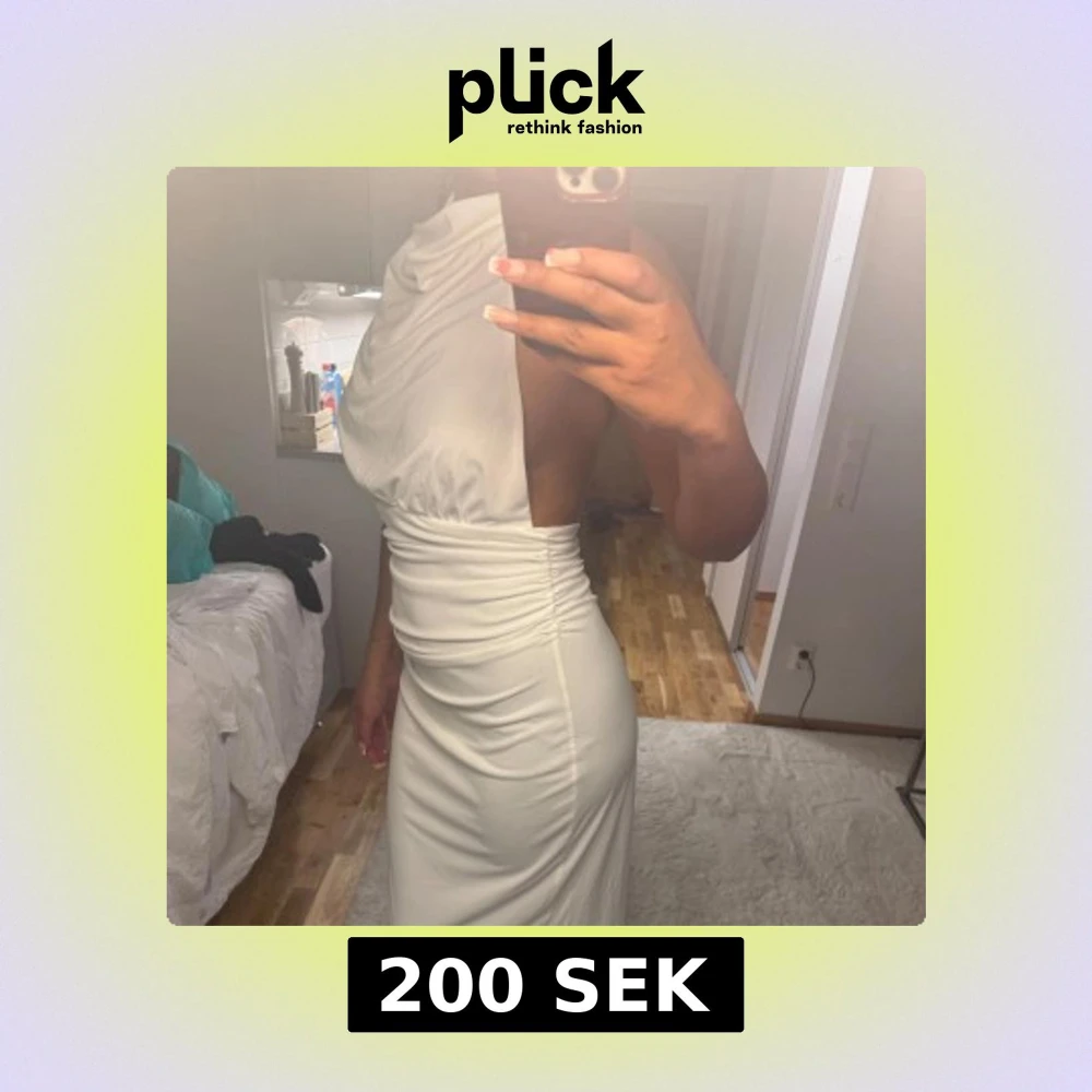Säljer en elegant vit långklänning från Zara i storlek M. Klänningen har en asymmetrisk one shoulder-design, draperad överdel och öppen rygg.