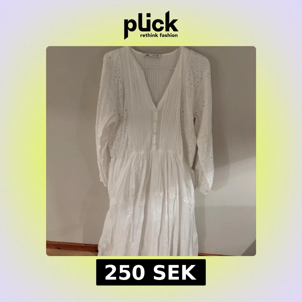 Superfin vit långklänning från Zara med broderade detaljer och hålmönster. Klänningen har v-ringning, knappar framtill och långa ärmar. Tillverkad i bomull, perfekt för sommarens alla tillfällen. Luftig och romantisk stil med volang och spetsdetaljer.