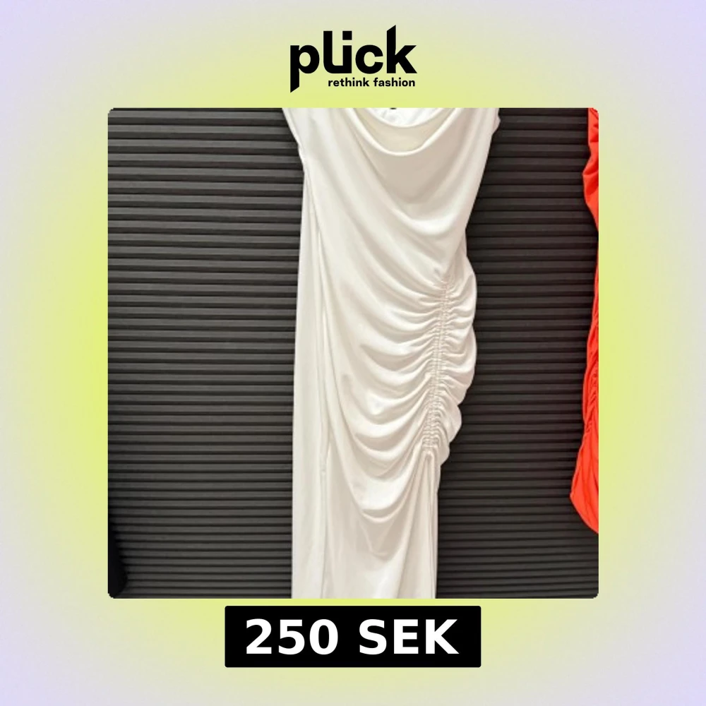 Säljer en elegant vit långklänning med smala axelband och snygg drapering längs sidan. Klänningen har en cowlneck-ringning och är tillverkad i ett mjukt, följsamt material som ger en lyxig känsla.