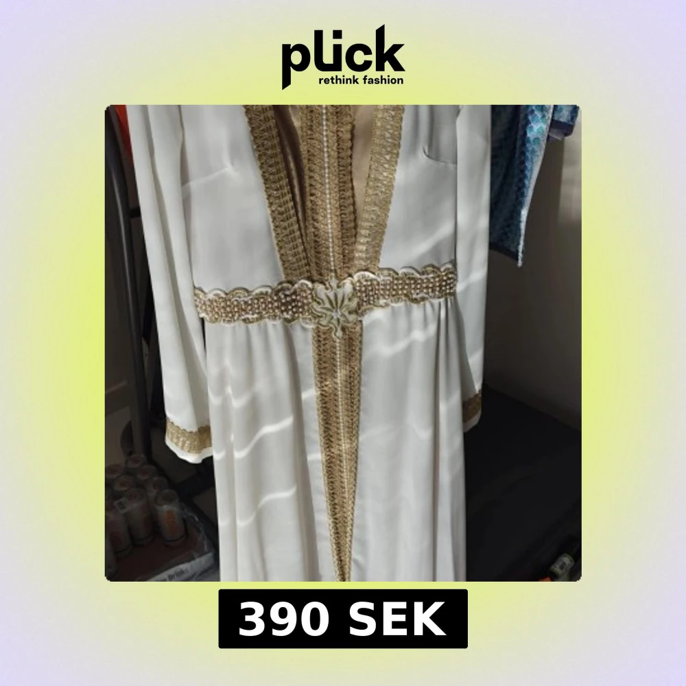 Elegant vit långklänning med guldiga broderade band och pärldetaljer längs midjan och framtill. Klänningen har långa ärmar och vackra gulddetaljer vid ärmslut och längs hela framsidan. Perfekt för speciella tillfällen.