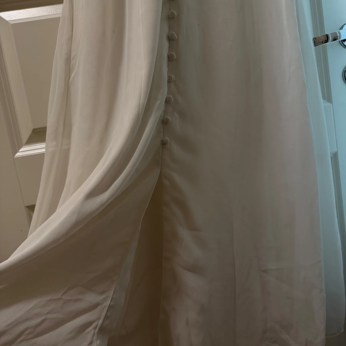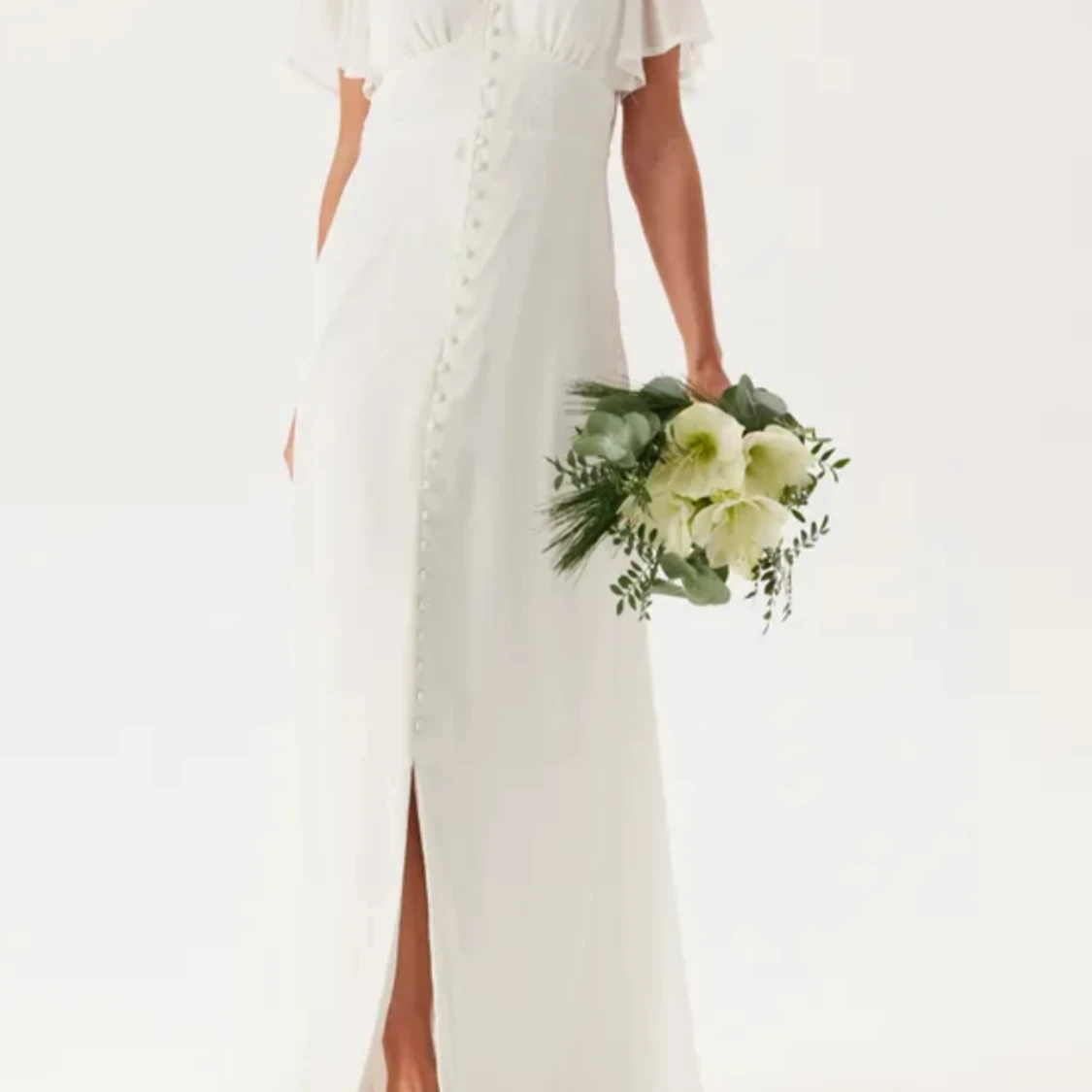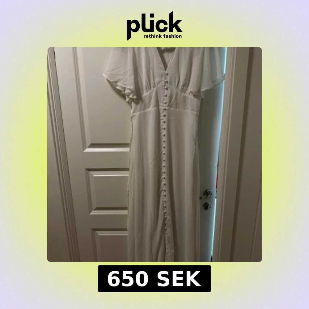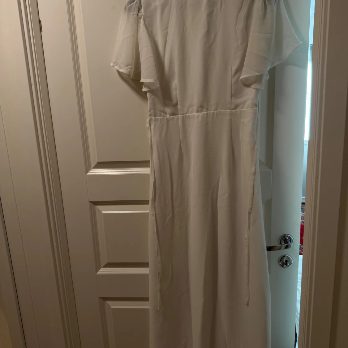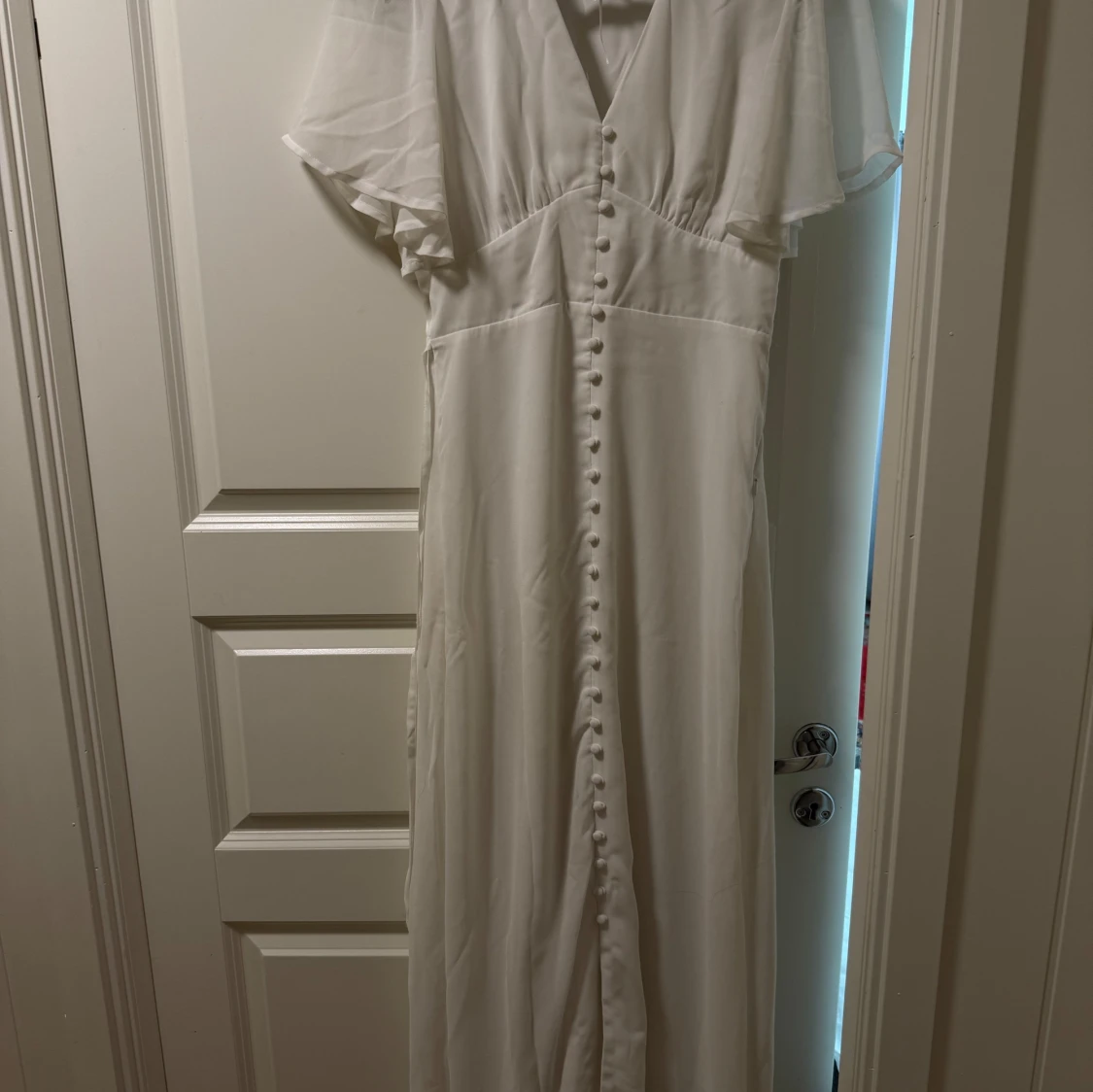Elegant vit långklänning med v-ringning, korta transparenta ärmar och dekorativa knappar längs hela framsidan. Klänningen har en snygg slits framtill och är tillverkad i ett lätt, flowy material som ger en romantisk känsla. Jag har bara användt klänningen en gång och det var då jag tog studenten, en jätte fin klänning