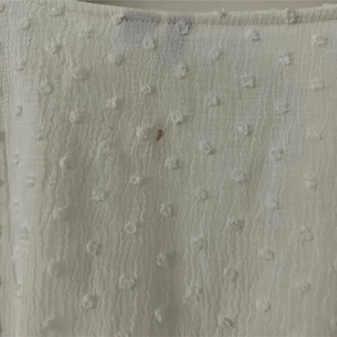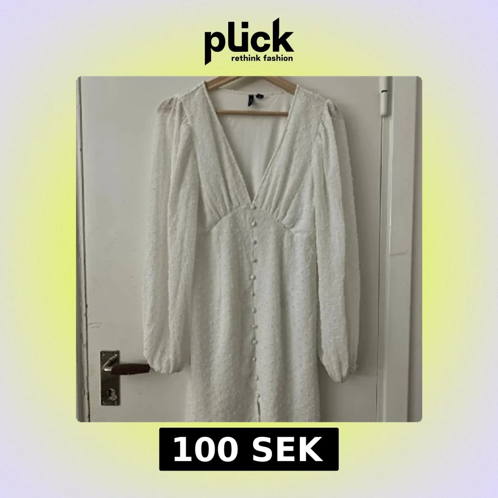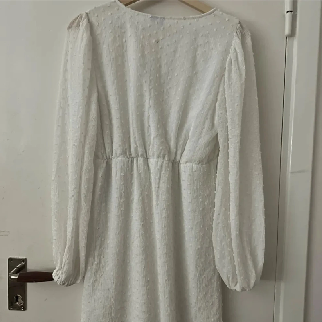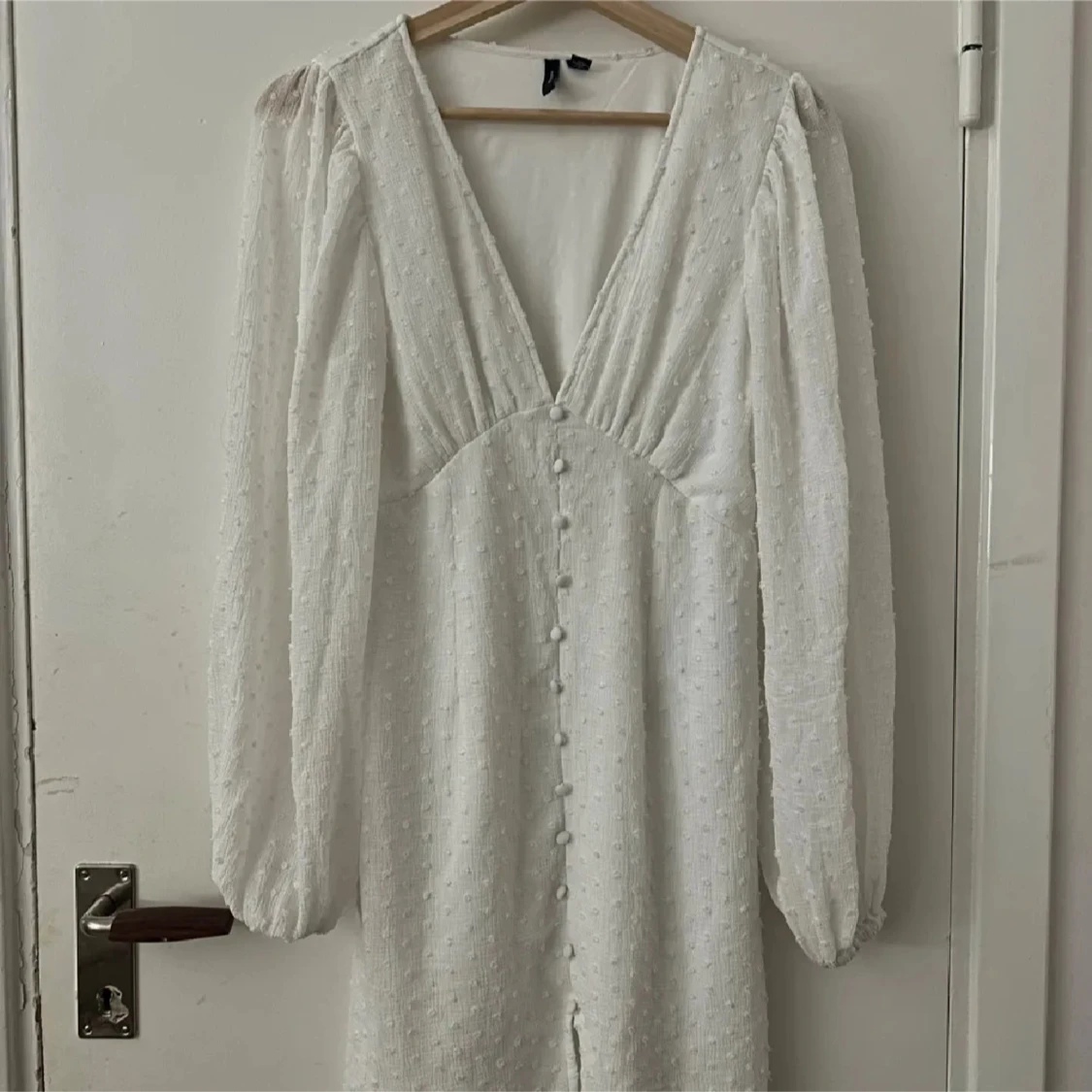 Superfin vit klänning med lång ärm och v-ringning. Klänningen har dekorativa knappar framtill och ett diskret prickigt strukturmönster i tyget. Dubbel tyg vilket gör att den inte ska vara see thru. Lätt puffade axlar och resår vid ärmslut ger en romantisk vibe. Har använts en gång och har en pytte liten fläck på övre delen av ryggen. Är dock perfekt för tex vår och sommar!🤍