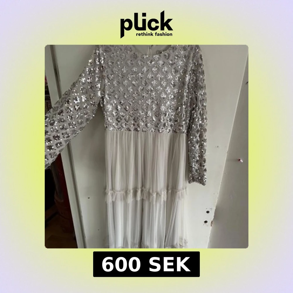 Säljer en vit långklänning från Reference med glittriga paljetter på överdelen och långa ärmar. Kjolen är i flera lager av tunn, transparent tyg med volangdetaljer. Perfekt för dig som vill sticka ut med en elegant look.