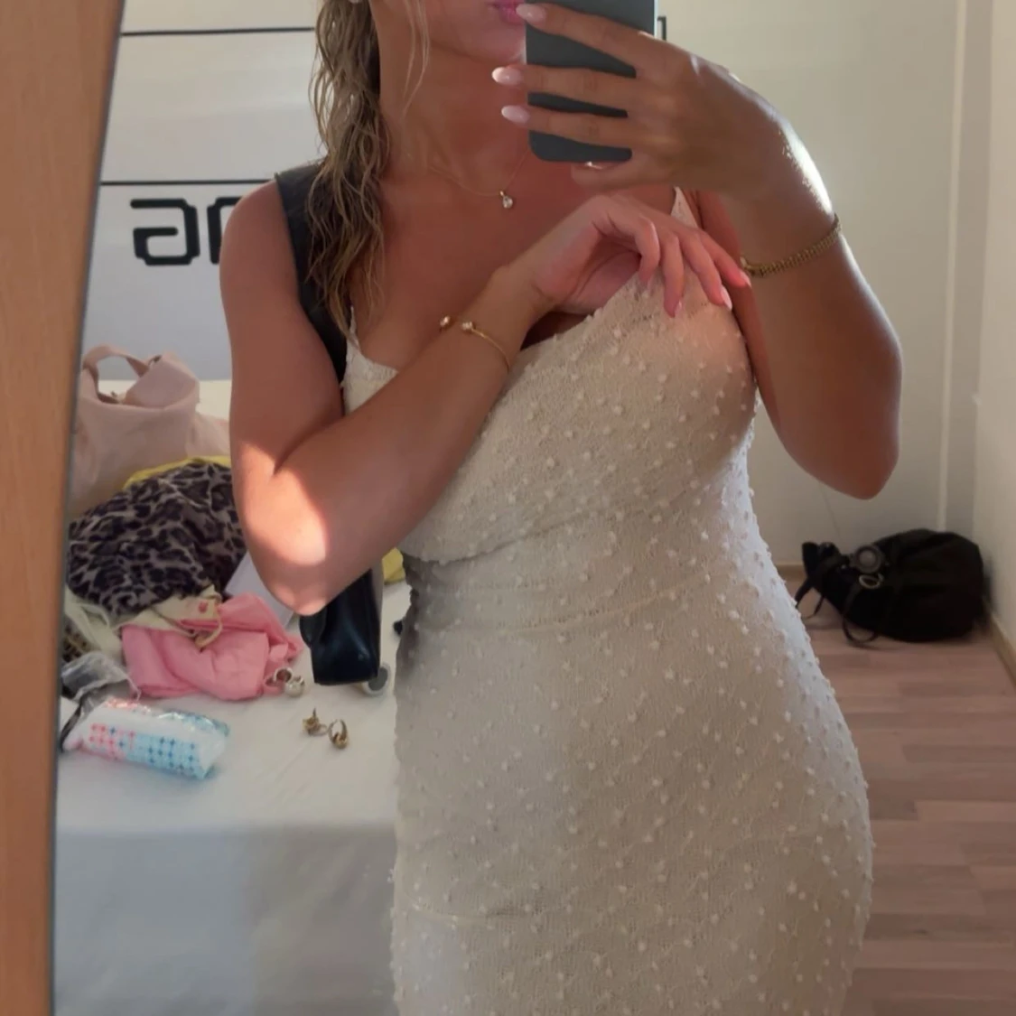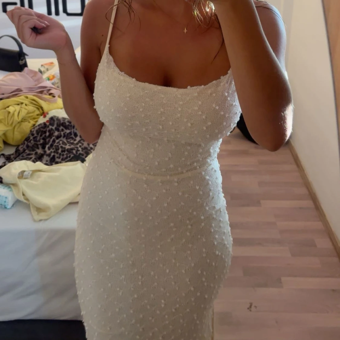 Säljer en superfin vit långklänning med smala axelband. Klänningen har en prickig struktur i tyget.