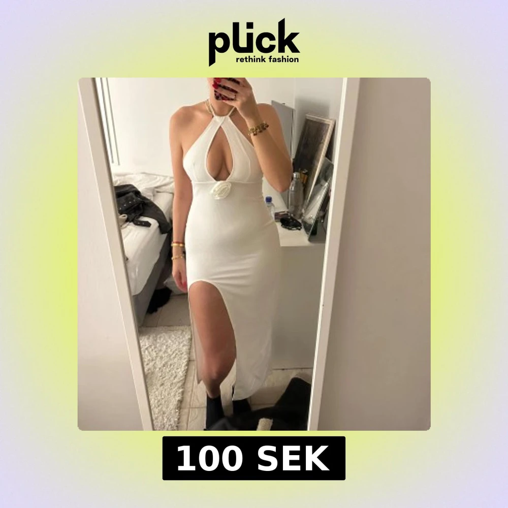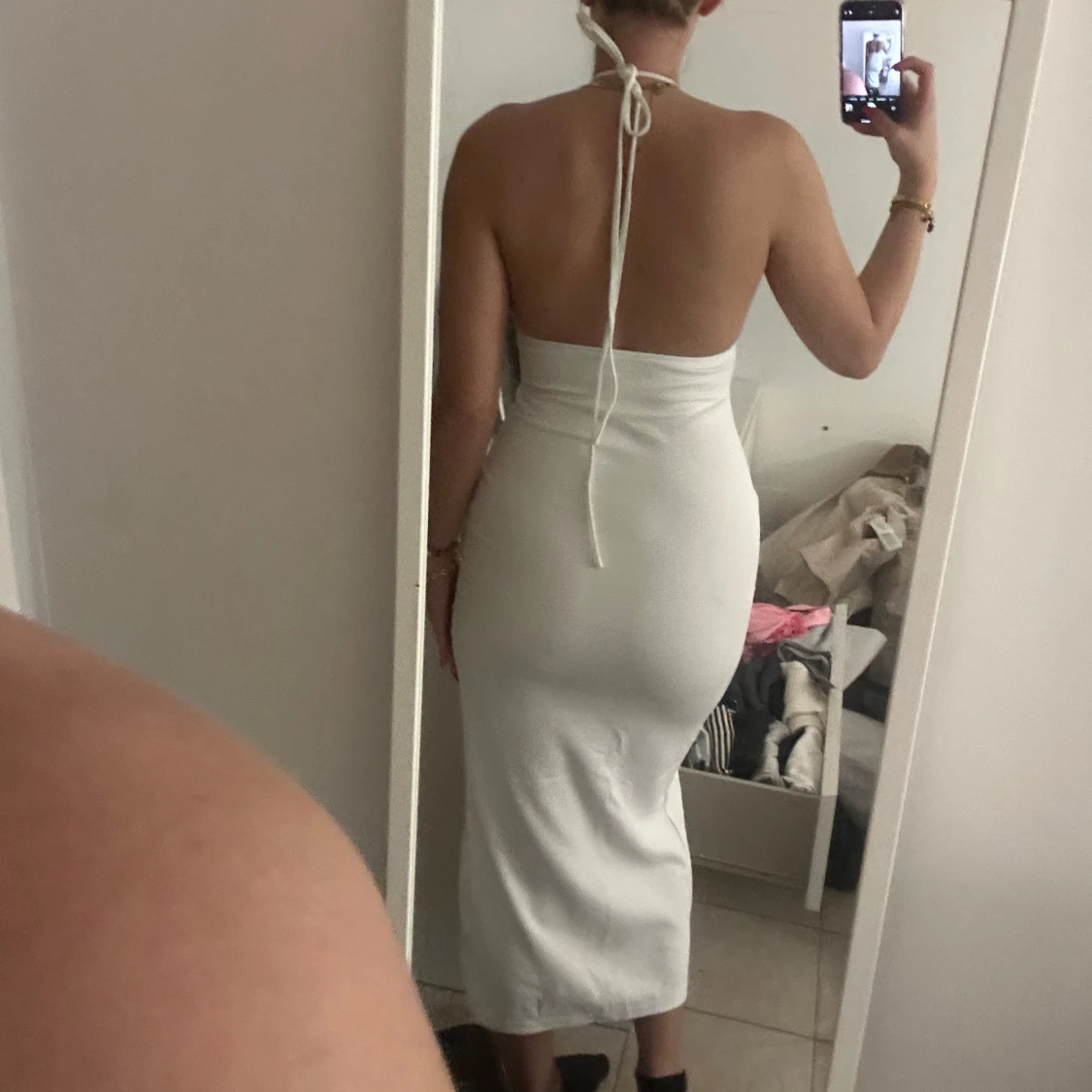 Säljer en vit långklänning med halterneck och öppen rygg. Klänningen har en snygg slits framtill och en dekorativ blomdetalj vid bysten. Tight passform och knytning i nacken. Perfekt för sommarens alla tillfällen.