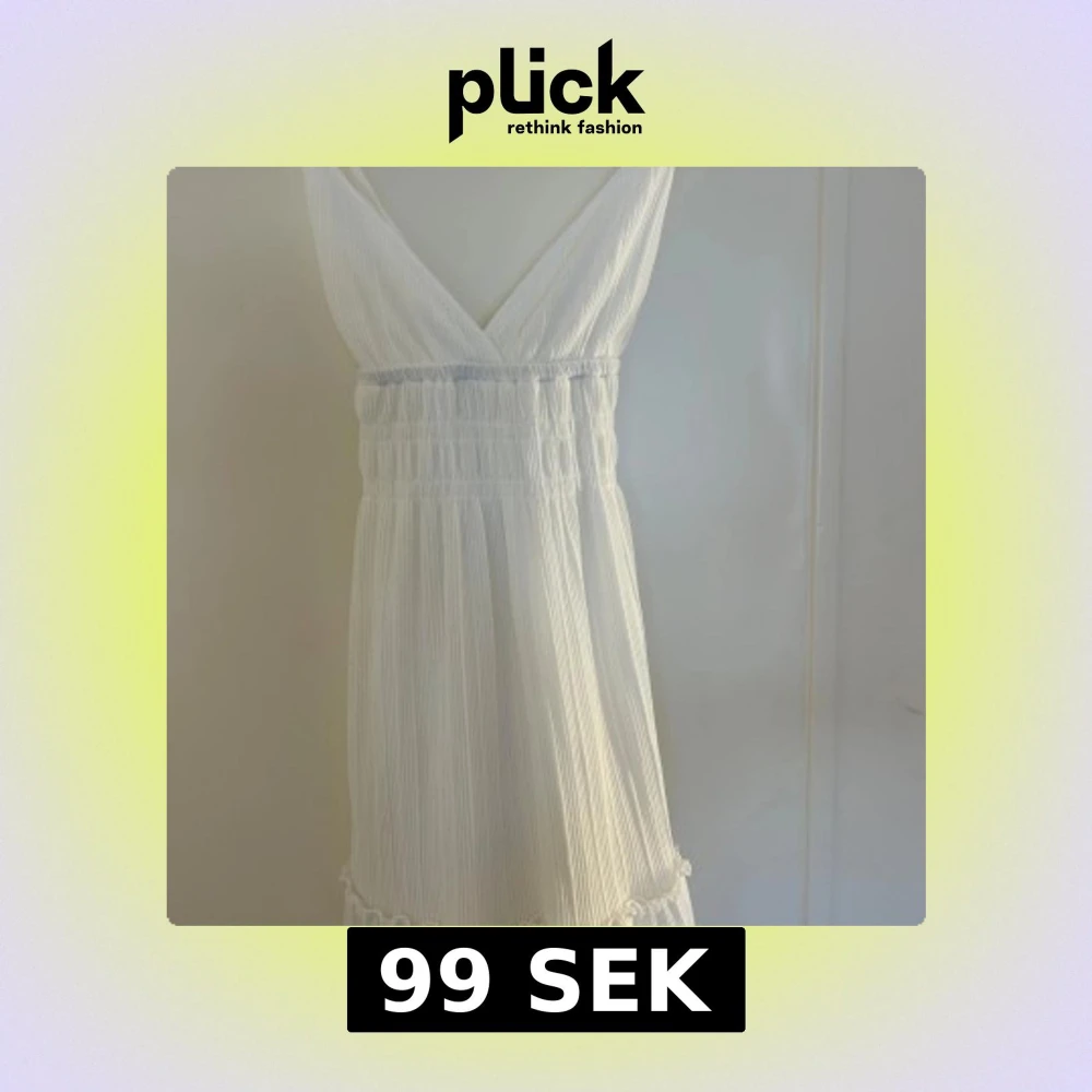Superfin vit långklänning med smala axelband som korsas i ryggen. Klänningen har v-ringning, resår i midjan och volangdetaljer nertill. Tunt, lätt tyg med diskret struktur – perfekt för varma dagar.