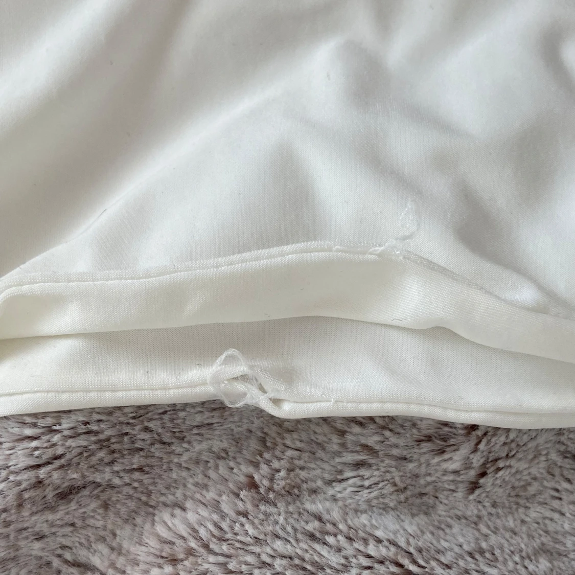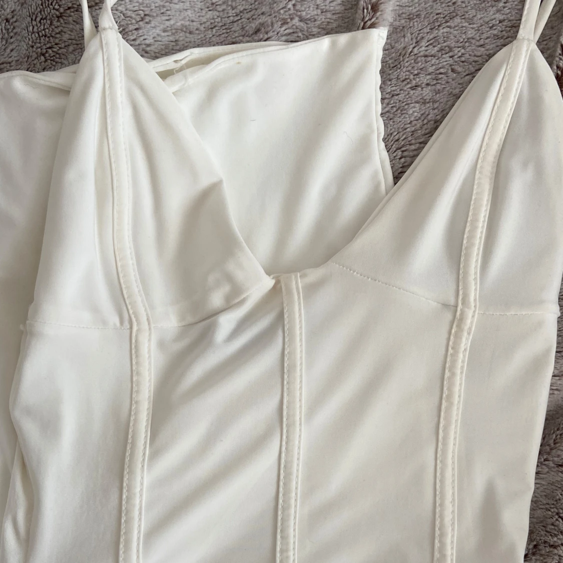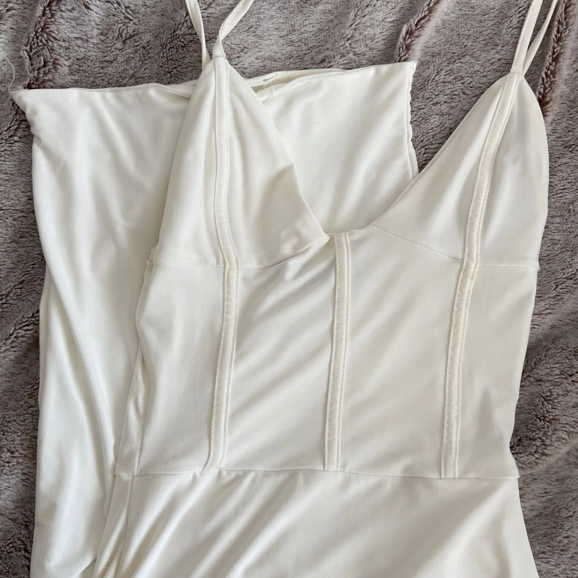 Säljer en stilren vit långklänning med smala axelband och djup v-ringning. Klänningen har figurnära passform och markerade sömmar framtill för en snygg siluett. Perfekt för sommarens tillfällen eller studentfirande. Är ej genomskinlig och sitter figurtajt på mig som har S normalt. Har fin mesh detalj baktill. Enda defekten är i slutet av klänningen längst ned har en sömn gått upp lite, se bild.