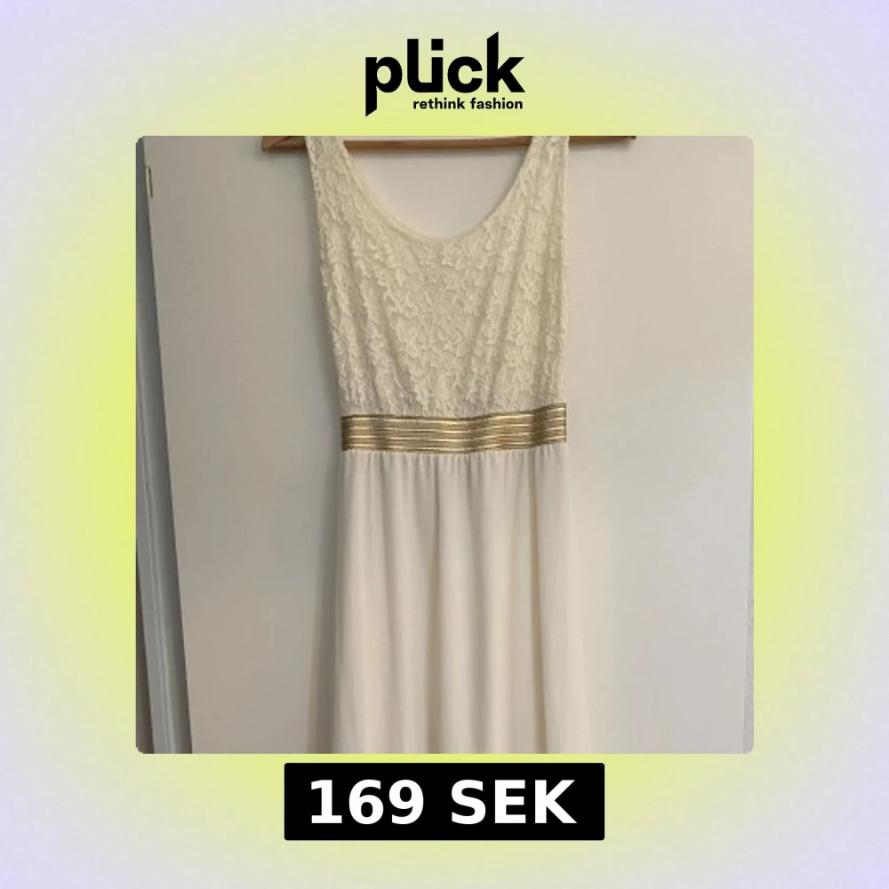 Elegant vit långklänning med spets upptill och ett brett guldigt band i midjan. Klänningen har ärmlös design och ett flowy, mjukt fall. Passar i många storlekar då den är stretchig S-L . Perfekt för dig som vill sticka ut med en klassisk och stilren look.