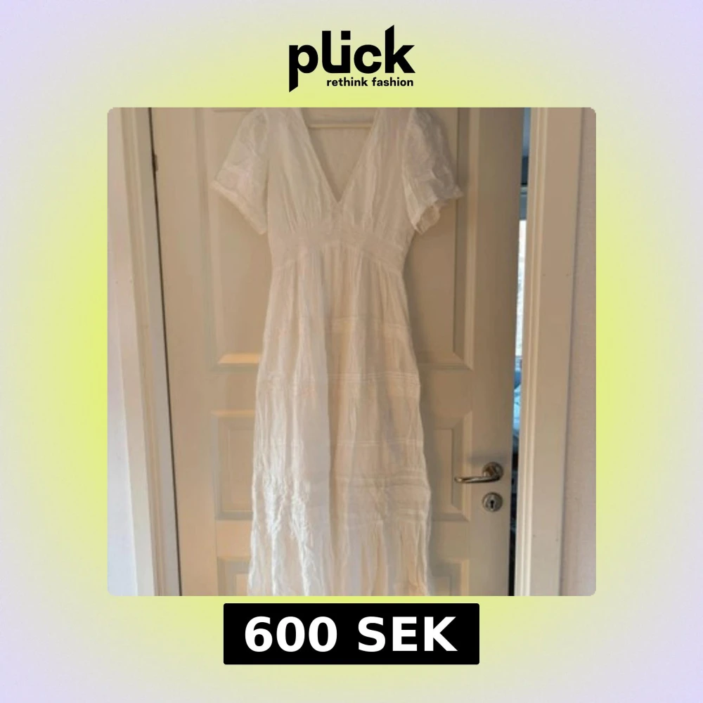 Superfin vit långklänning med v-ringning och korta ärmar. Klänningen har broderade prickar och spetsdetaljer längs midjan och kjolen. Luftigt material, perfekt för varma dagar. Romantisk och bohemisk vibe, passar dig som gillar detaljer och mjuka färger.