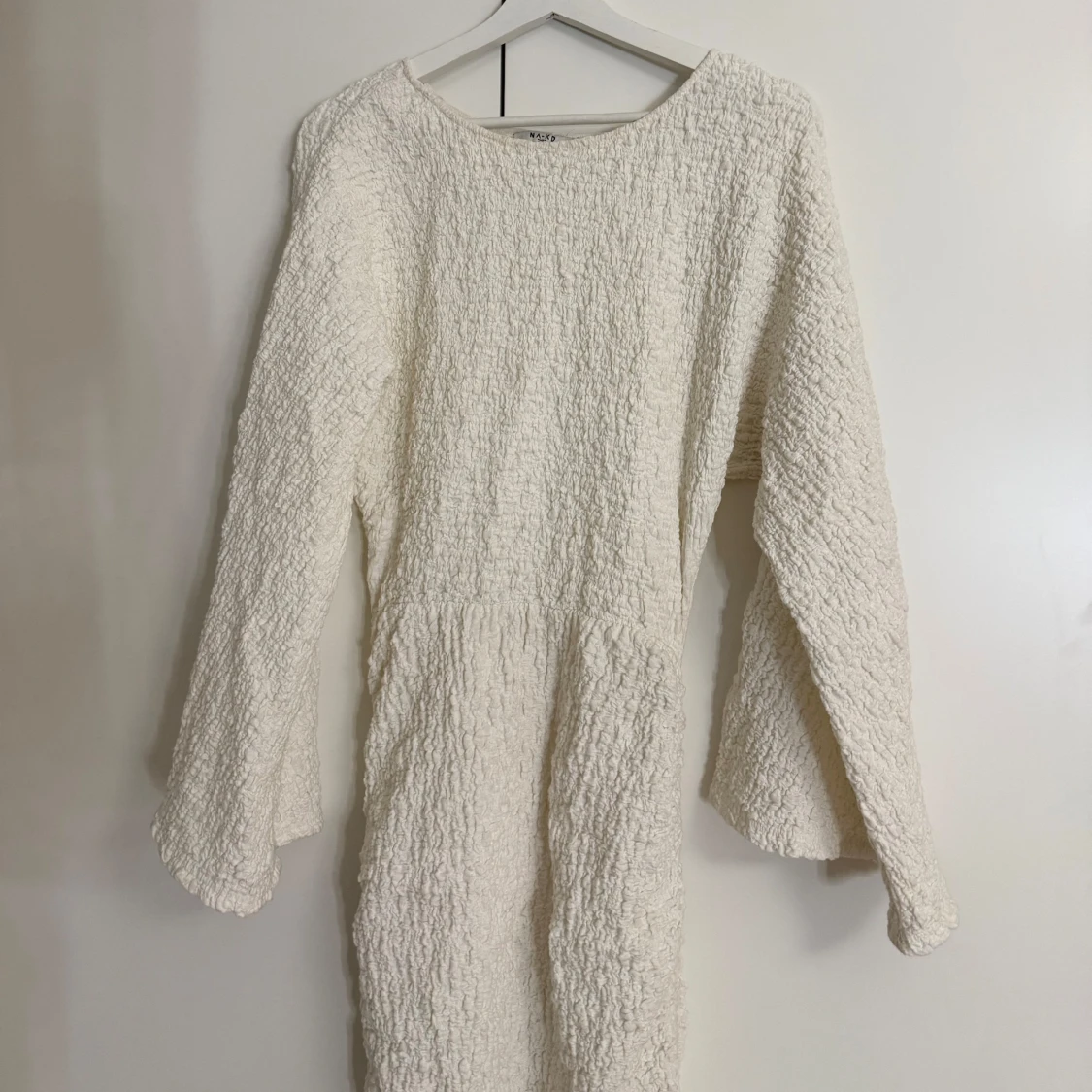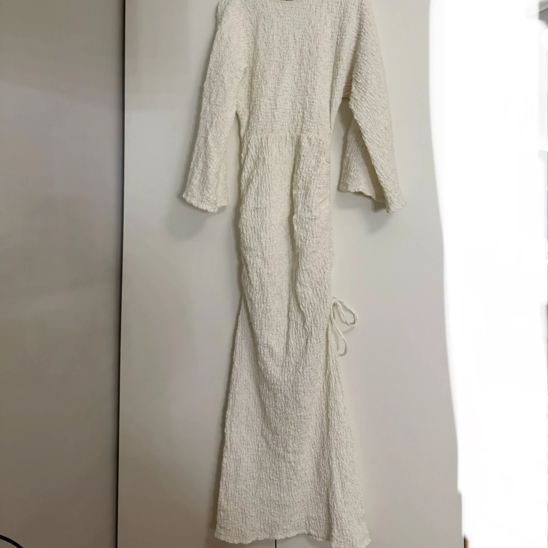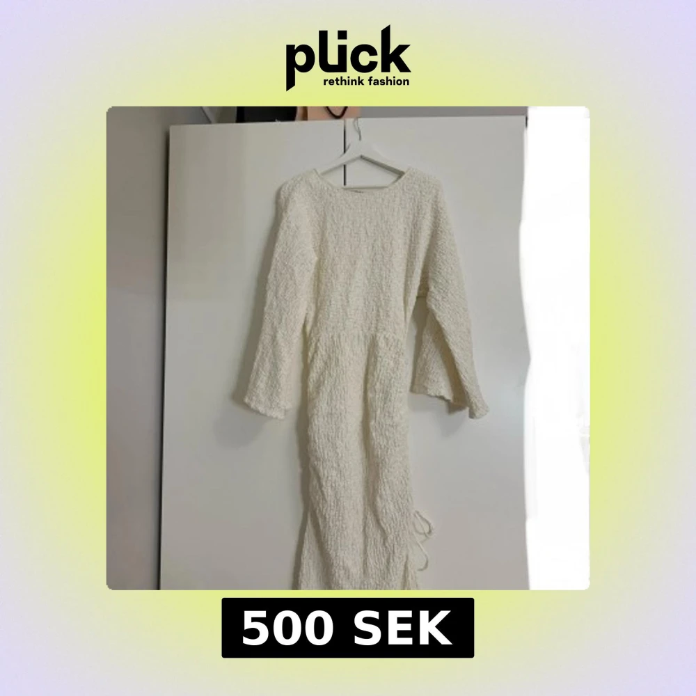 Så himla snygg vit långklänning med texturerat material och långa ärmar.💞Klänningen har en såå snygg passform och en subtil slits på sidan som går att justera. Den är även väldigt lång, jag är 170 och den går hela vägen ner till marken. Perfekt för speciella tillfällen. Tyvärr aldrig använd för jag fick hem fel storlek, så den är helt ny! Orginalpris 800kr!🙌🏽