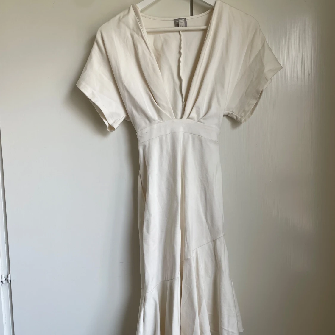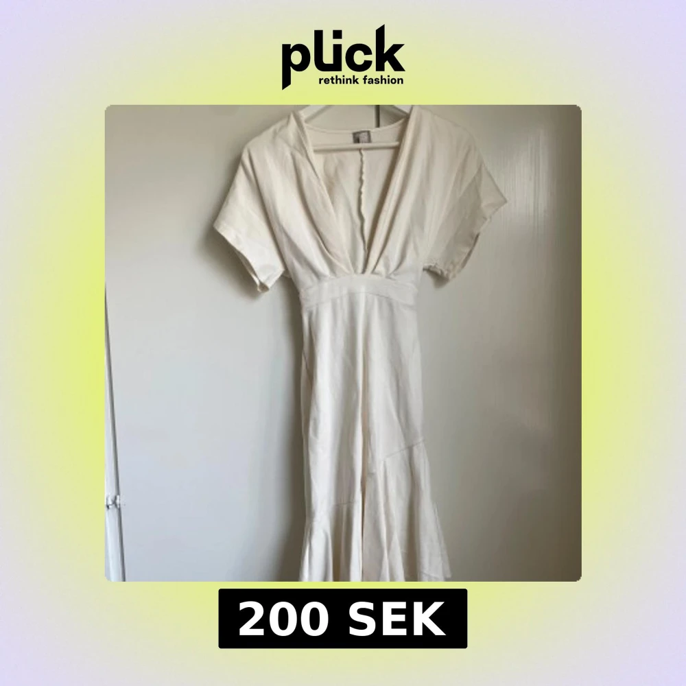 Elegant vit långklänning med djup v-ringning och korta ärmar. Klänningen har en markerad midja och ett lätt utsvängt fall nertill. Perfekt för sommarens alla tillfällen och ger en stilren och fräsch look.