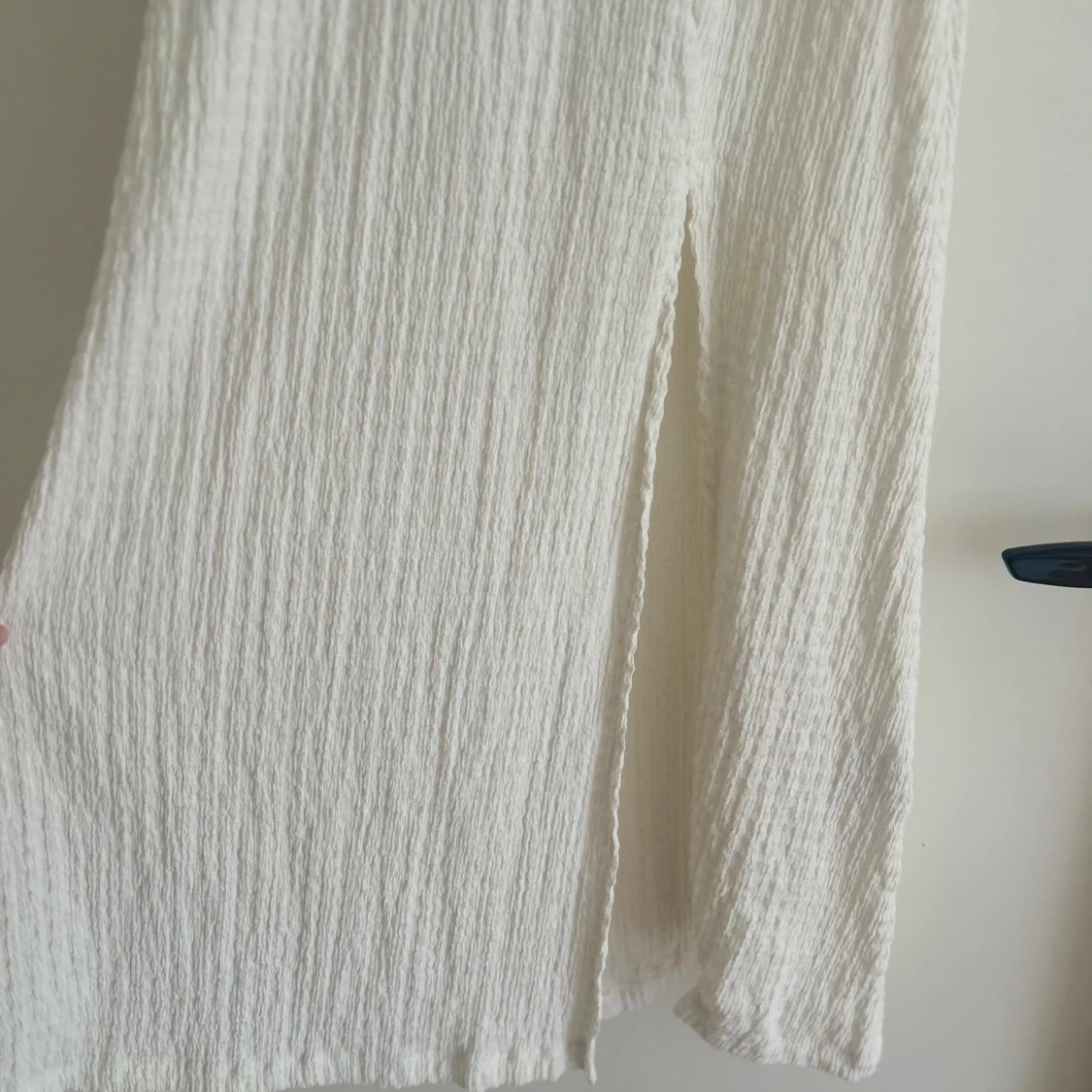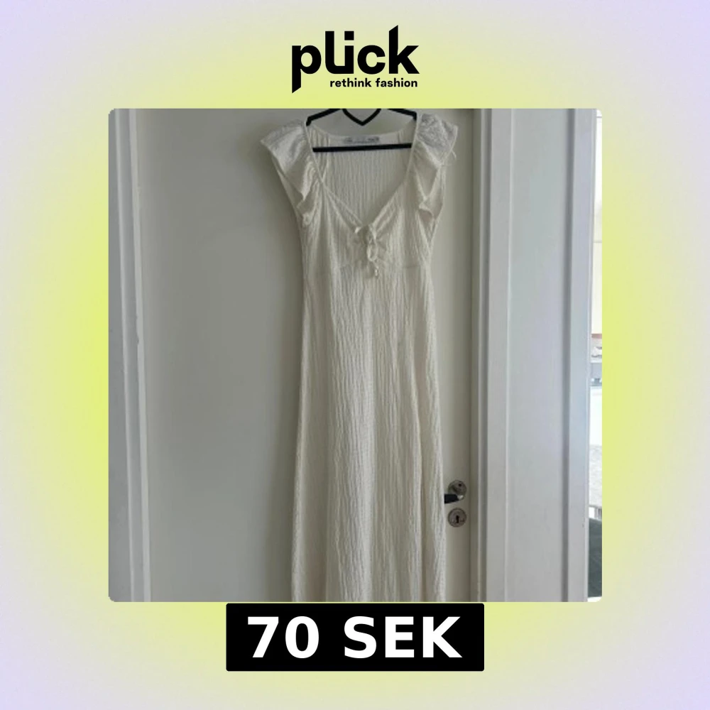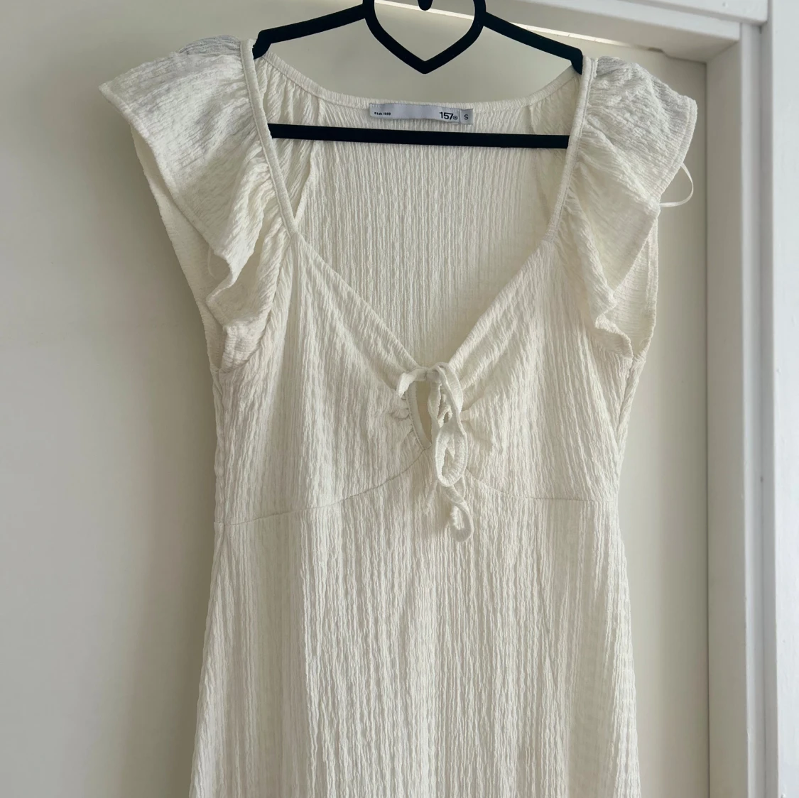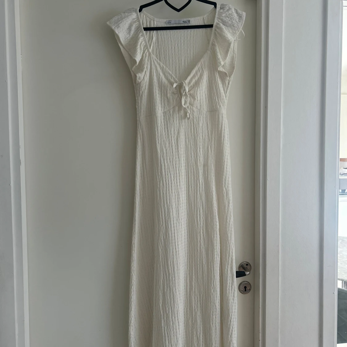 Superfin vit långklänning med volangdetaljer vid axlarna, v-ringning och knyt framtill. Klänningen har en slits på sidan och är gjord i ett mjukt, strukturerat bomullstyg. Perfekt för varma dagar och somriga vibes!
