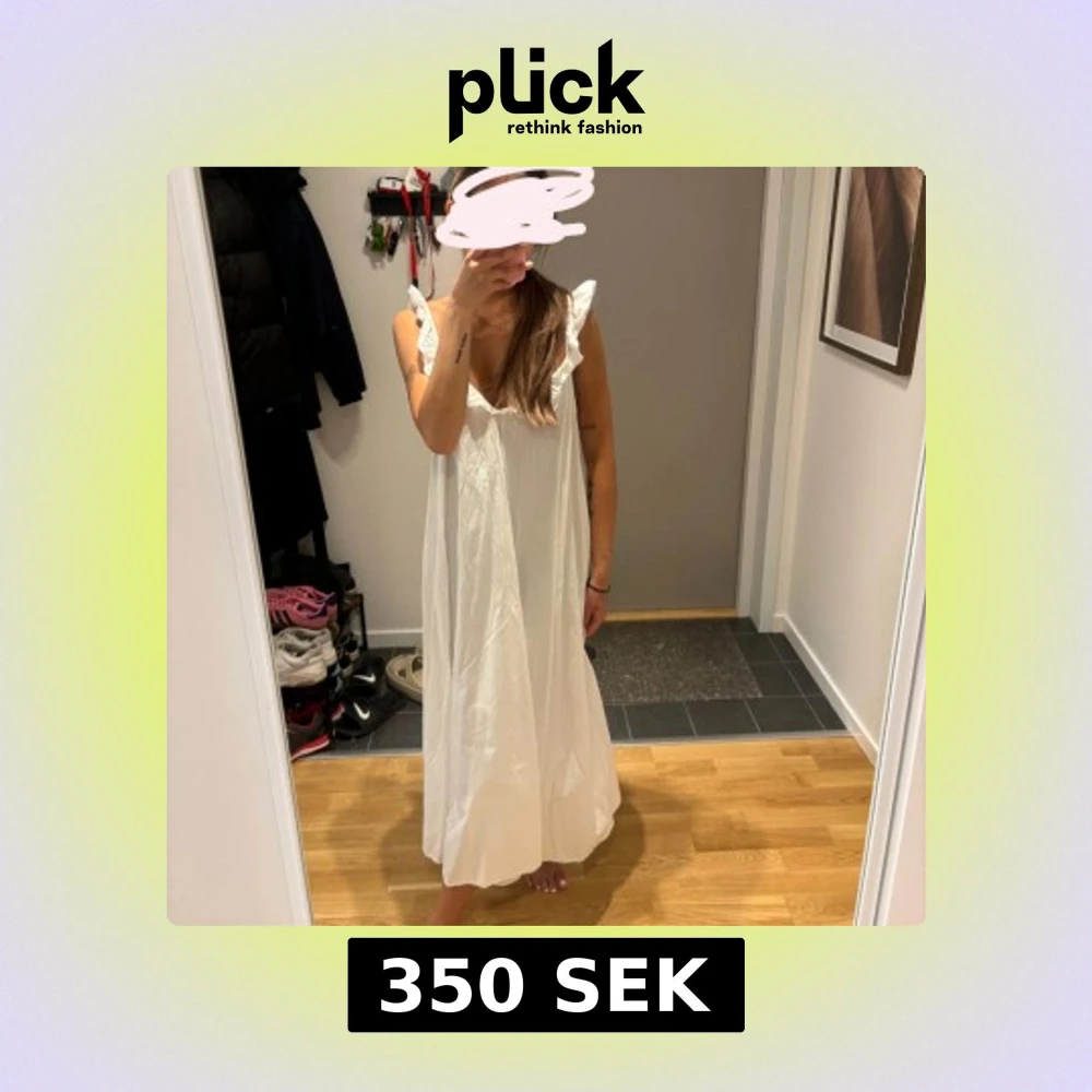 Superfin vit långklänning med volangdetaljer på axelbanden och djup v-ringning. Klänningen har öppen rygg, vilket ger en luftig och somrig känsla. Endast använt 1 gång, postar direkt!💞💞💞